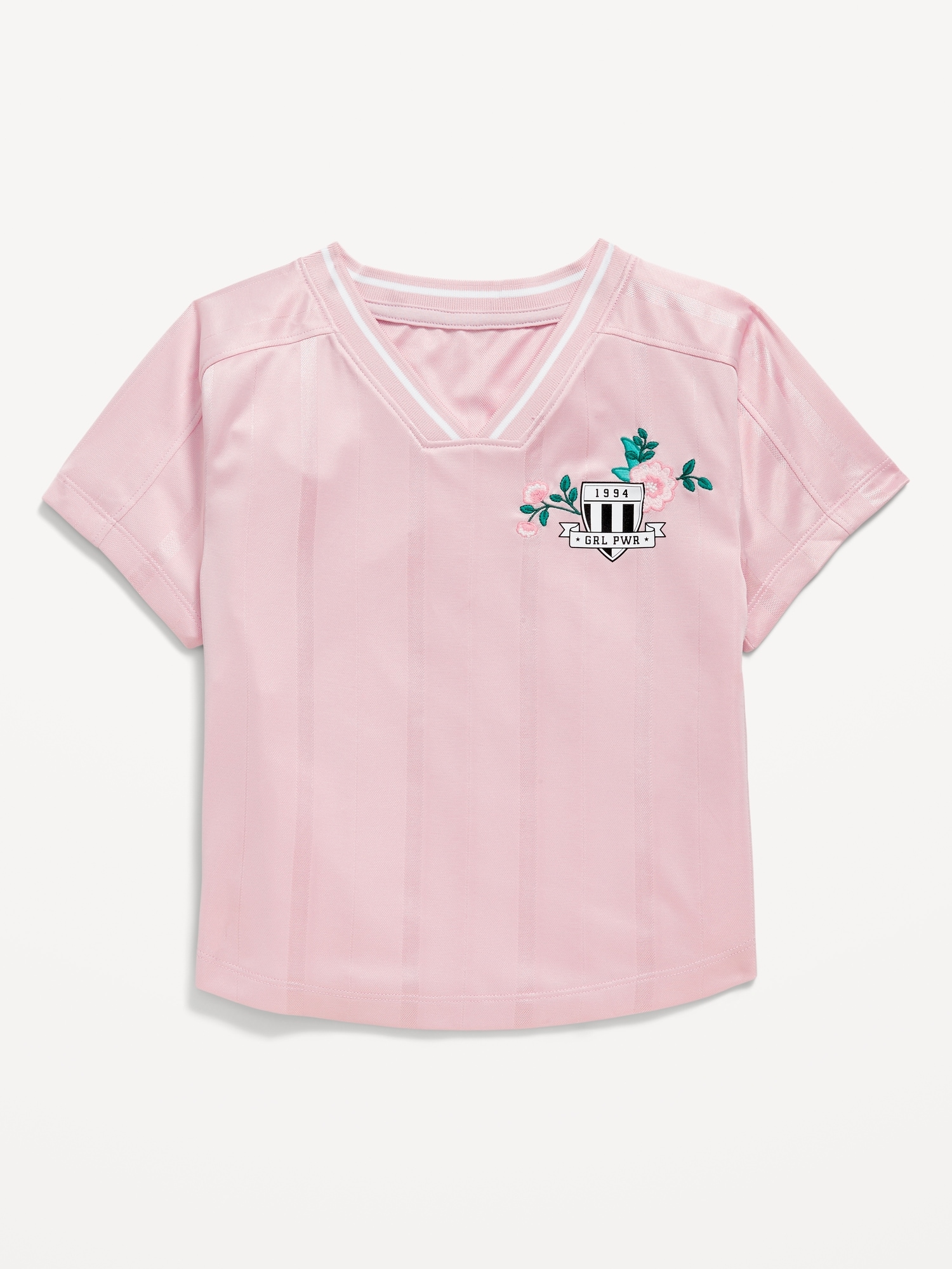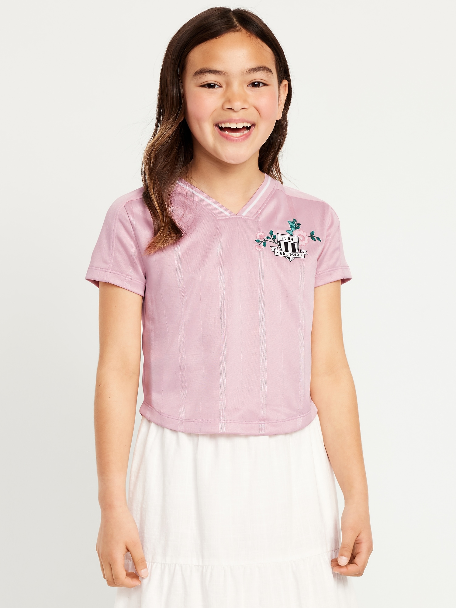 Short-Sleeve Graphic Jersey T-Shirt for Girls: v neck, short sleeves, graphic at front, rounded hem, #763221