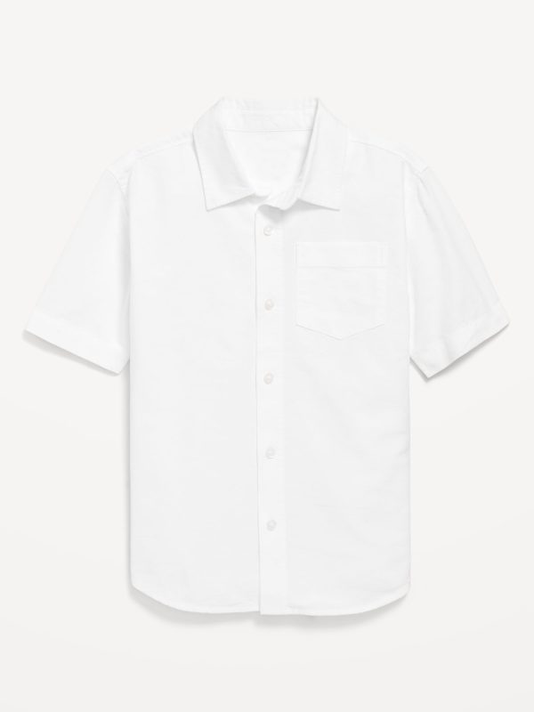 Short-Sleeve Oxford Shirt for Boys: spread collar, short sleeves, patch pocket at chest, full-length buttoned placket, all-over print, #865930