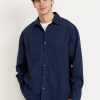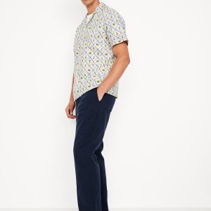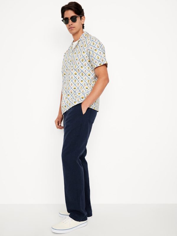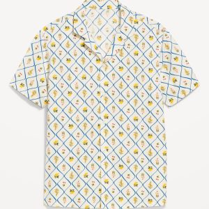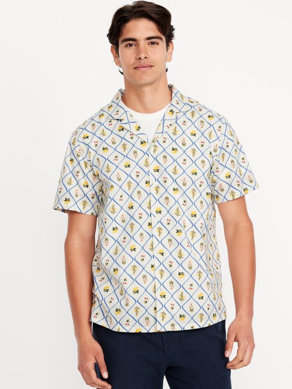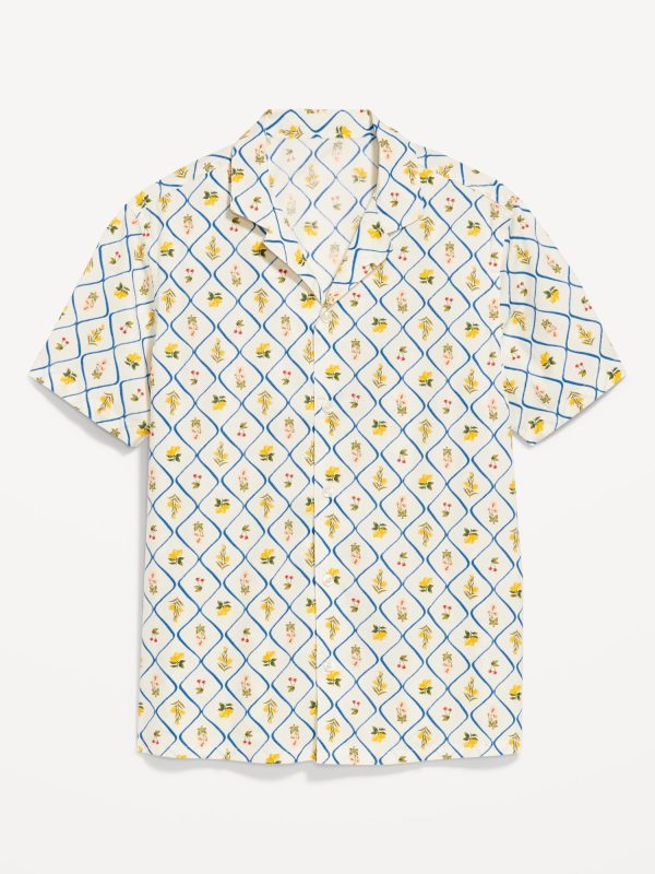 Short-Sleeve Printed Camp Shirt: notched collar, short sleeves, full-button front, vertical striped print, #762762