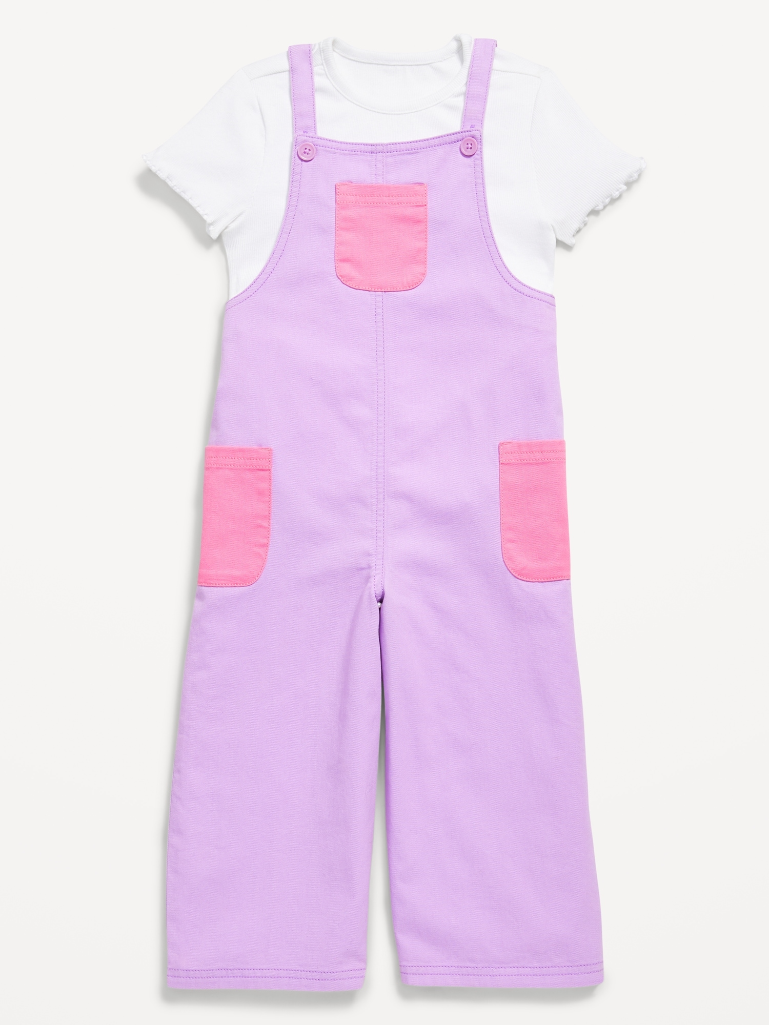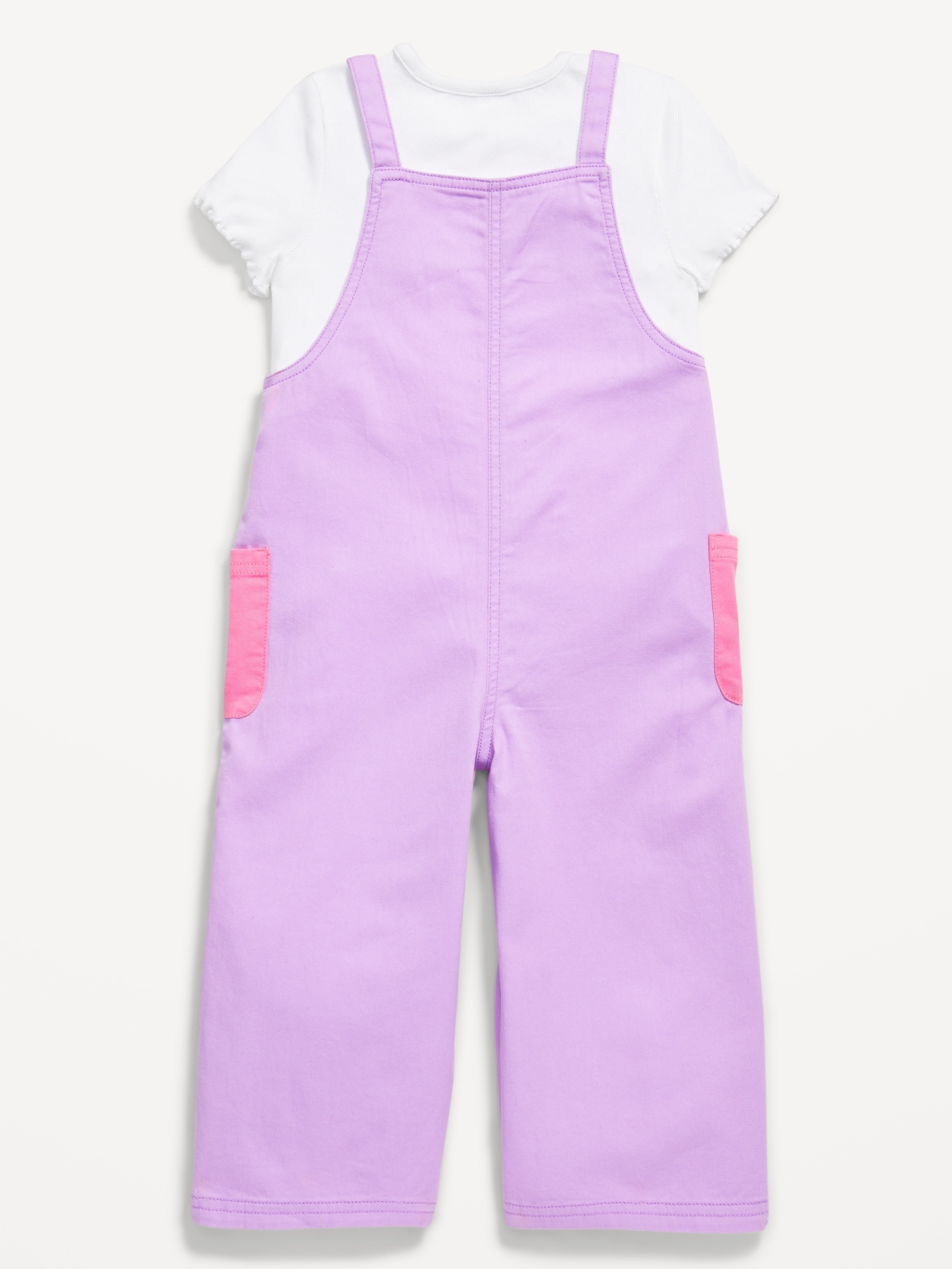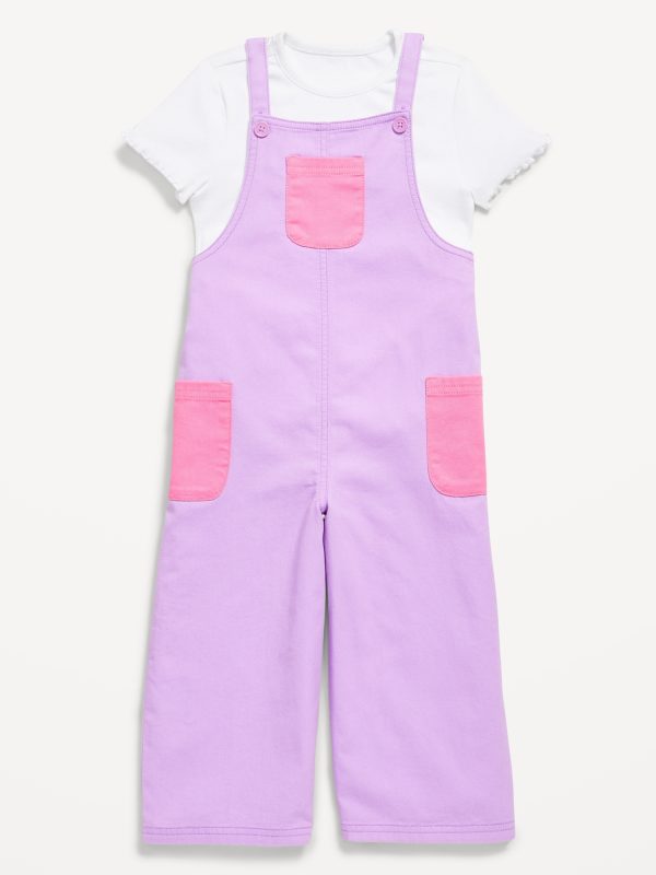 Short-Sleeve T-Shirt and Pocket Jumpsuit Set for Toddler Girls: crew neck, short sleeves, coordinating jumpsuit, square neckline, adjustable shoulder straps, patch pocket at front, patch pockets at hips, color block, #767011