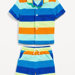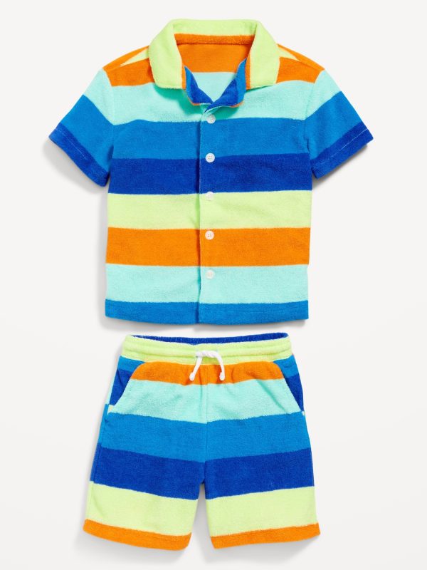 Short-Sleeve Terry Shirt and Shorts Set for Toddler Boys: spread collar, short sleeves, full length button placket, matching shorts, elasticized waistband, functional drawstring, diagonal on-seam pockets, single patch pocket at back, all-over stripes, #750655