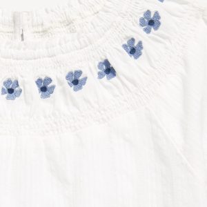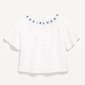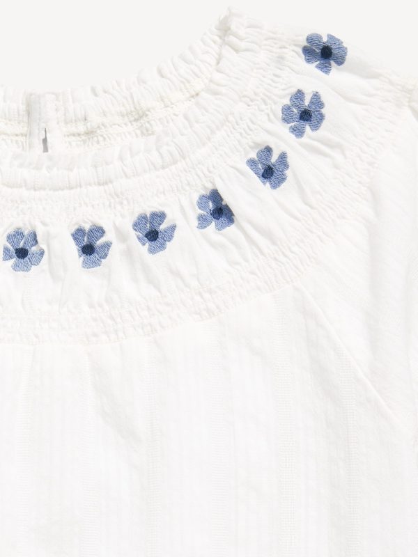 Short-Sleeve Textured Embroidered Top for Girls: smocked neckline, keyhole cutout with button loop closure at nape, embroidered floral pattern along neck, short sleeves, #806079