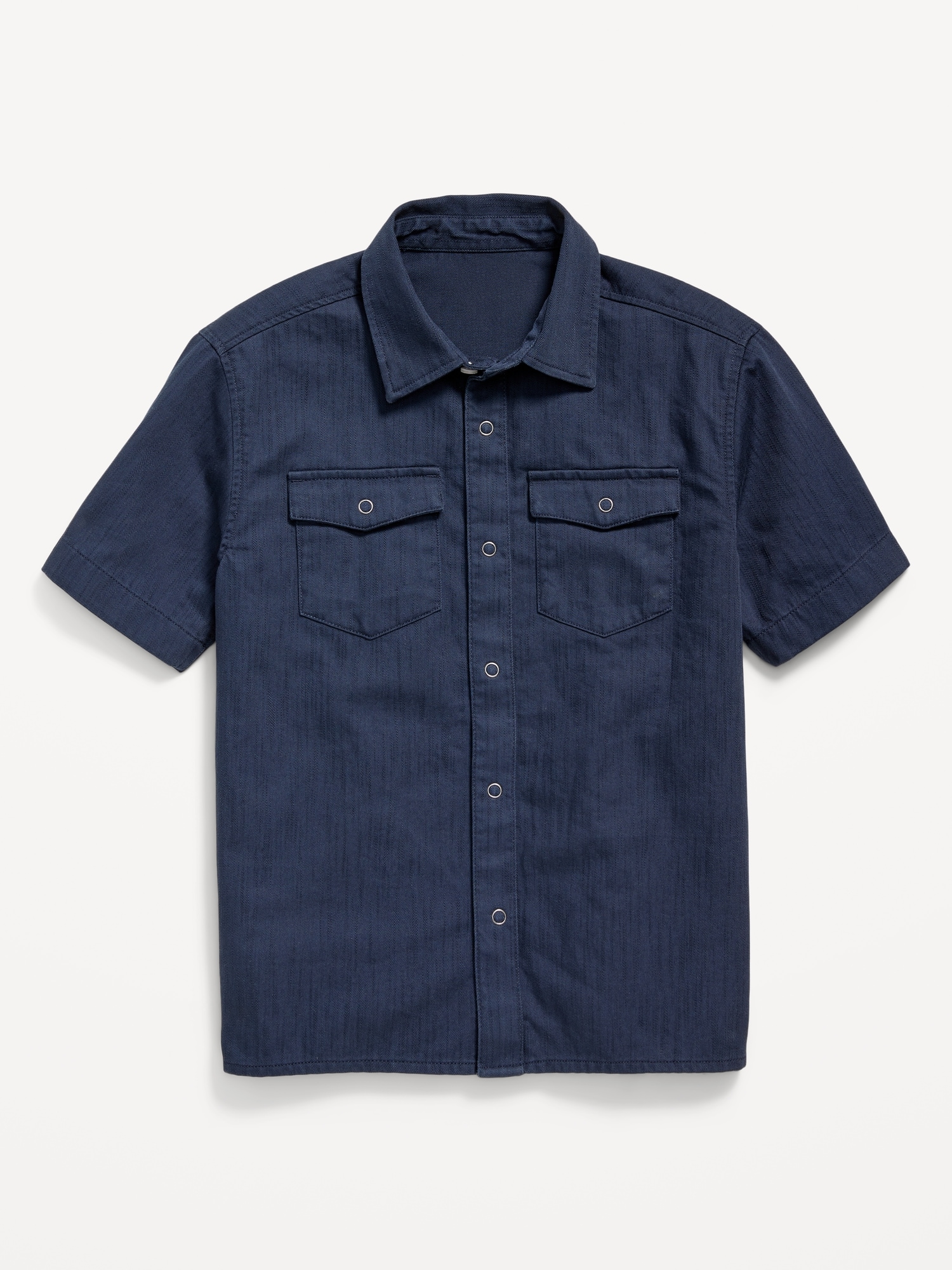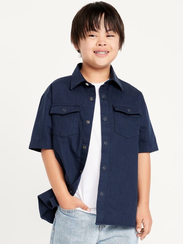 Short-Sleeve Western Pocket Shirt for Boys: pointed collar, short sleeves, snap-button flap pockets at chest, full length snap-button placket, #790172