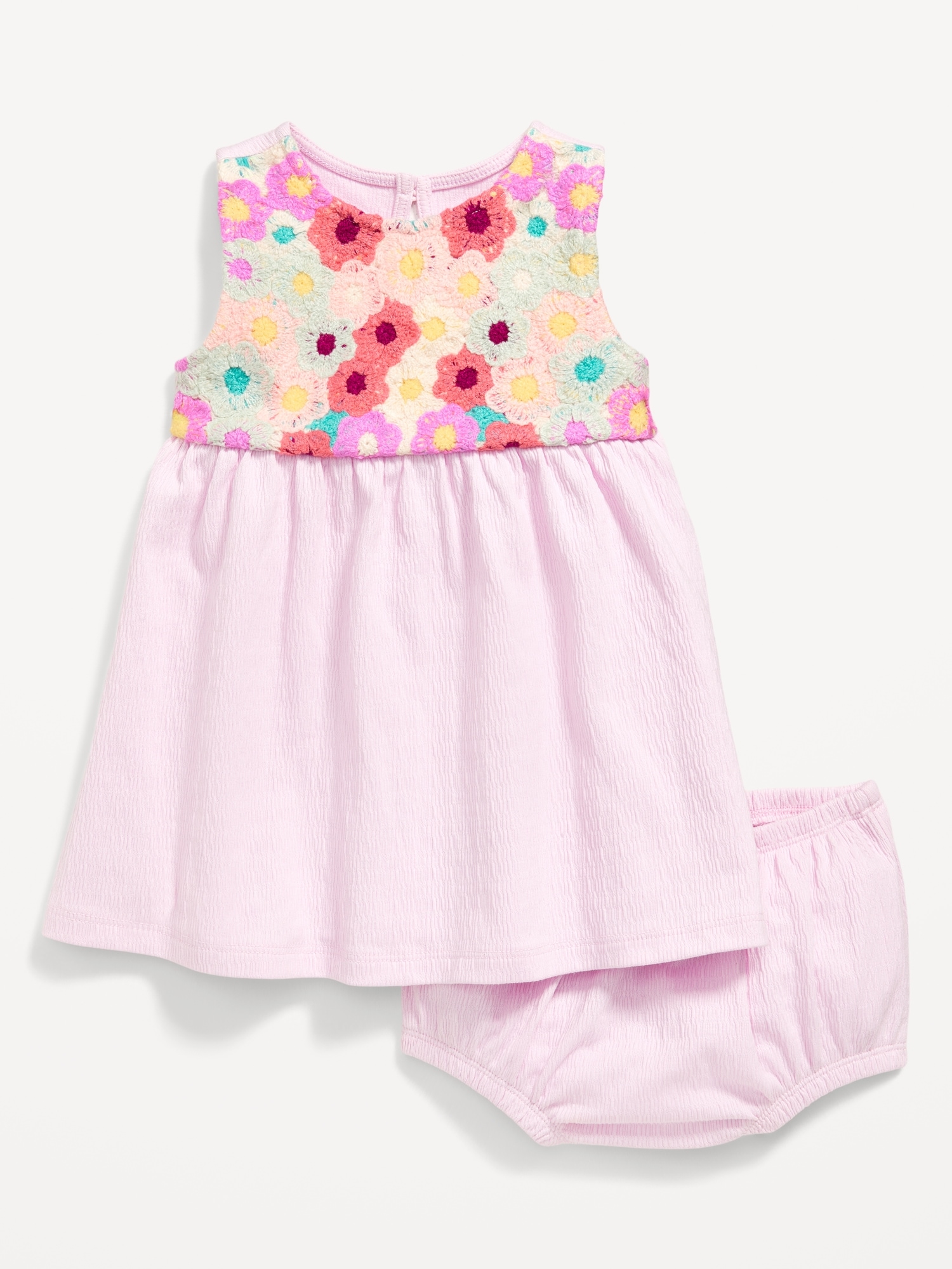 Sleeveless Crochet-Panel Dress and Shorts Set for Baby: rounded neckline, sleeveless, crochet knit at front, keyhole cutout at nape, seamed waist, full skirt, matching bloomer shorts, elasticized waistband, elasticized ruffled leg openings, #761812
