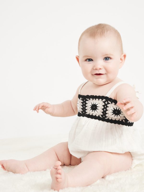 Sleeveless Double-Weave One-Piece Romper for Baby: straight neckline, tie bows at shoulder straps, crochet panel across chest, buttoned placket at back, elasticized bubble leg cuffs, hidden snaps along inseam, #761814