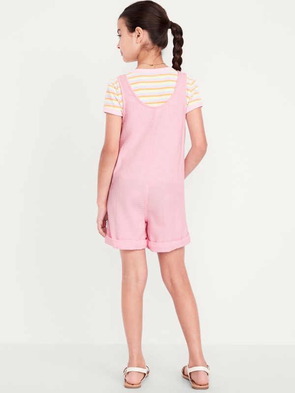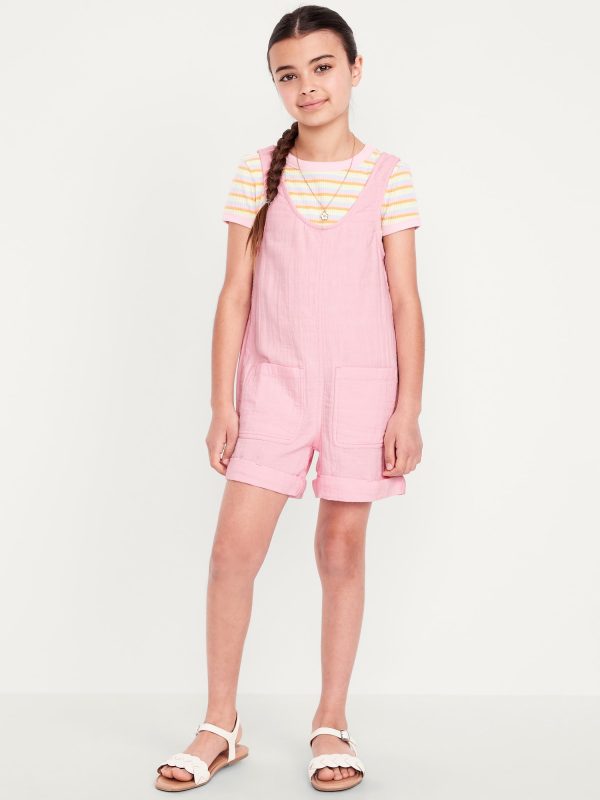 Sleeveless Double-Weave Pocket Romper for Girls: deep scoop neck, sleeveless, patch pockets at front, rolled leg cuffs, #766632