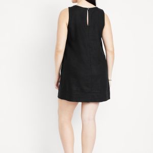 Sleeveless Linen-Blend Mini Shift Dress: high neck, sleeveless, side-seam pockets, button-loop closure at nape, darted bust, all-over floral and fruit print, #766928