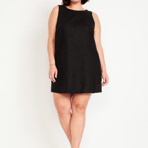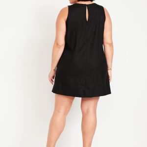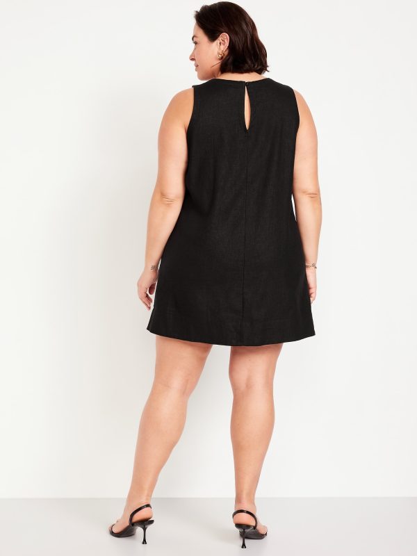 Sleeveless Linen-Blend Mini Shift Dress: high neck, sleeveless, side-seam pockets, button-loop closure at nape, darted bust, all-over floral and fruit print, #766928