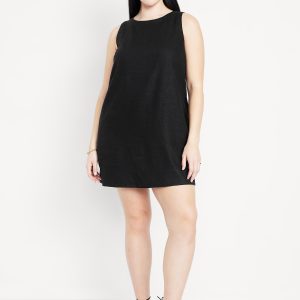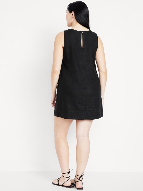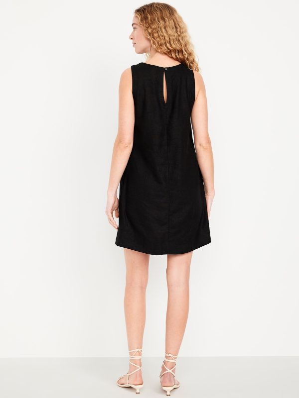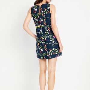 Sleeveless Linen-Blend Mini Shift Dress: high neck, sleeveless, side-seam pockets, button-loop closure at nape, darted bust, all-over floral and fruit print, #766928