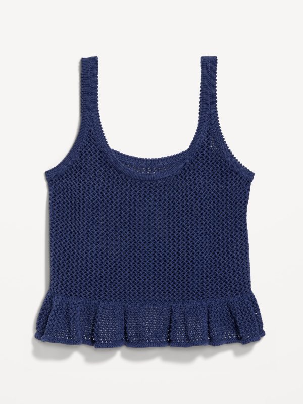 Sleeveless Open-Stitch Peplum Sweater: scoop neck, wide straps, floral appliqué accents, ruffled peplum hem, #761610