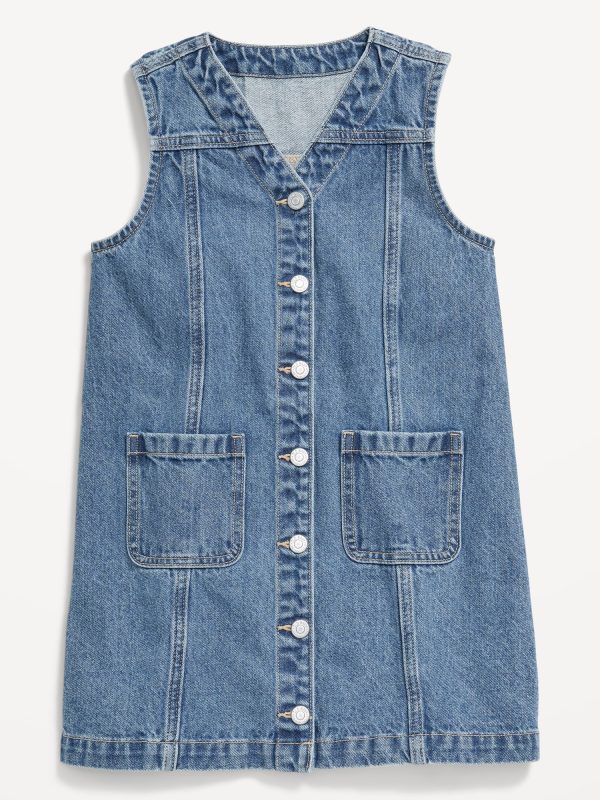 Sleeveless Pocket Jean Dress for Girls: v neck, sleeveless, patch pockets at front, full-length snap-button placket in sizes xs-m, full length regular button placket in sizes l-xxl, #803047