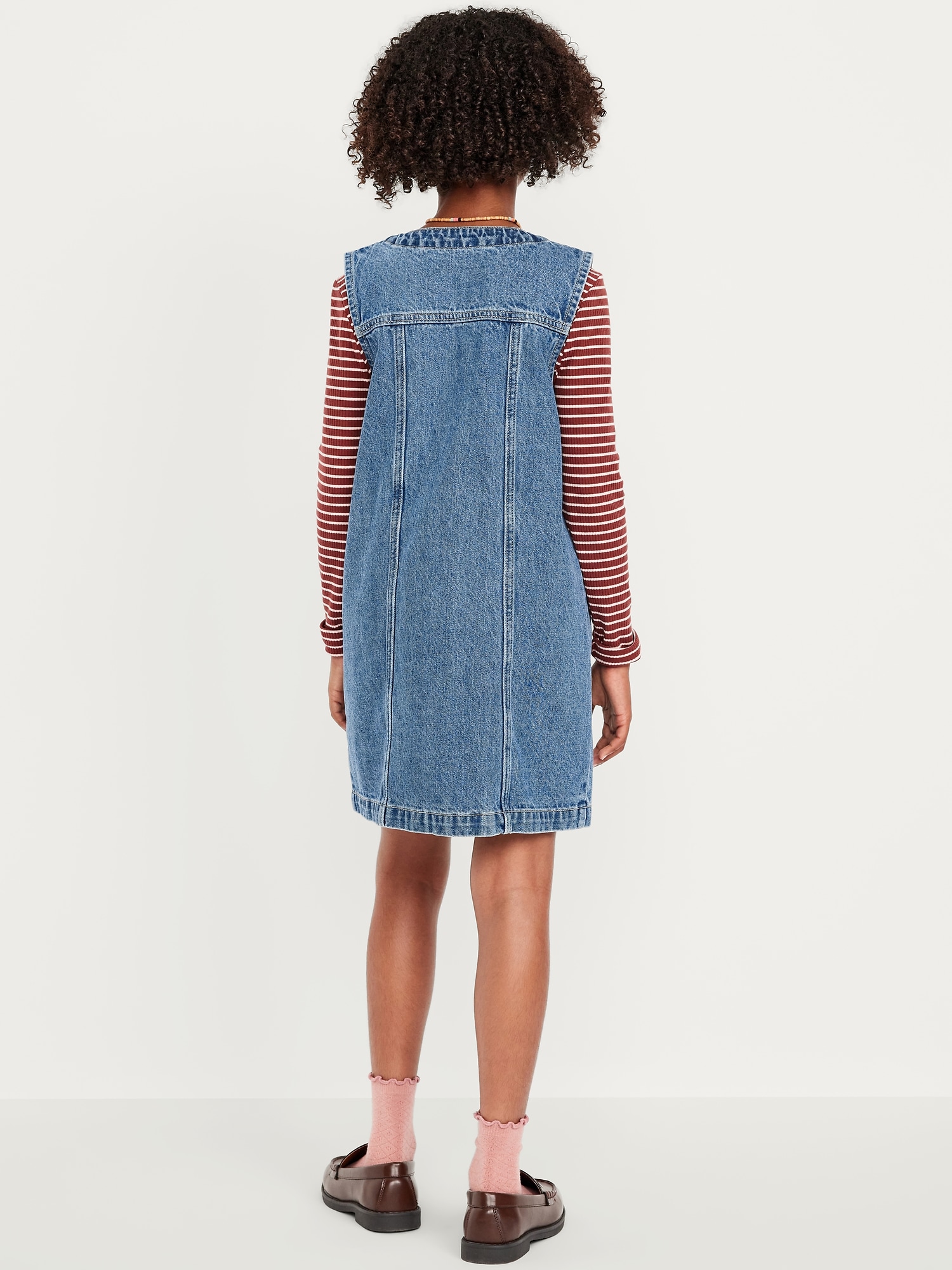 Sleeveless Pocket Jean Dress for Girls: v neck, sleeveless, patch pockets at front, full-length snap-button placket in sizes xs-m, full length regular button placket in sizes l-xxl, #803047