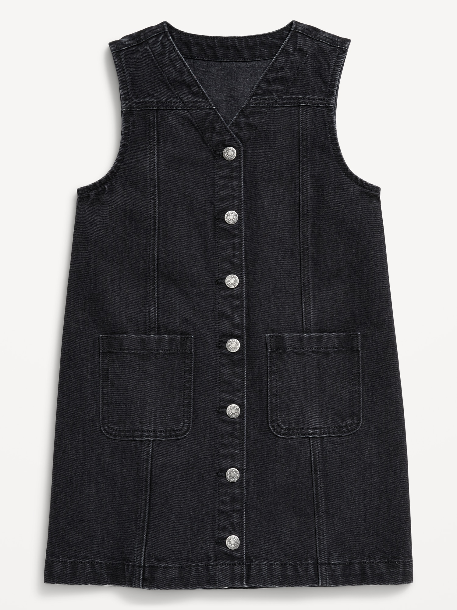 Sleeveless Pocket Jean Dress for Girls: v neck, sleeveless, patch pockets at front, full-length snap-button placket in sizes xs-m, full length regular button placket in sizes l-xxl, #803047