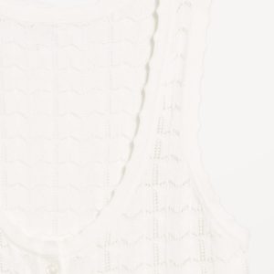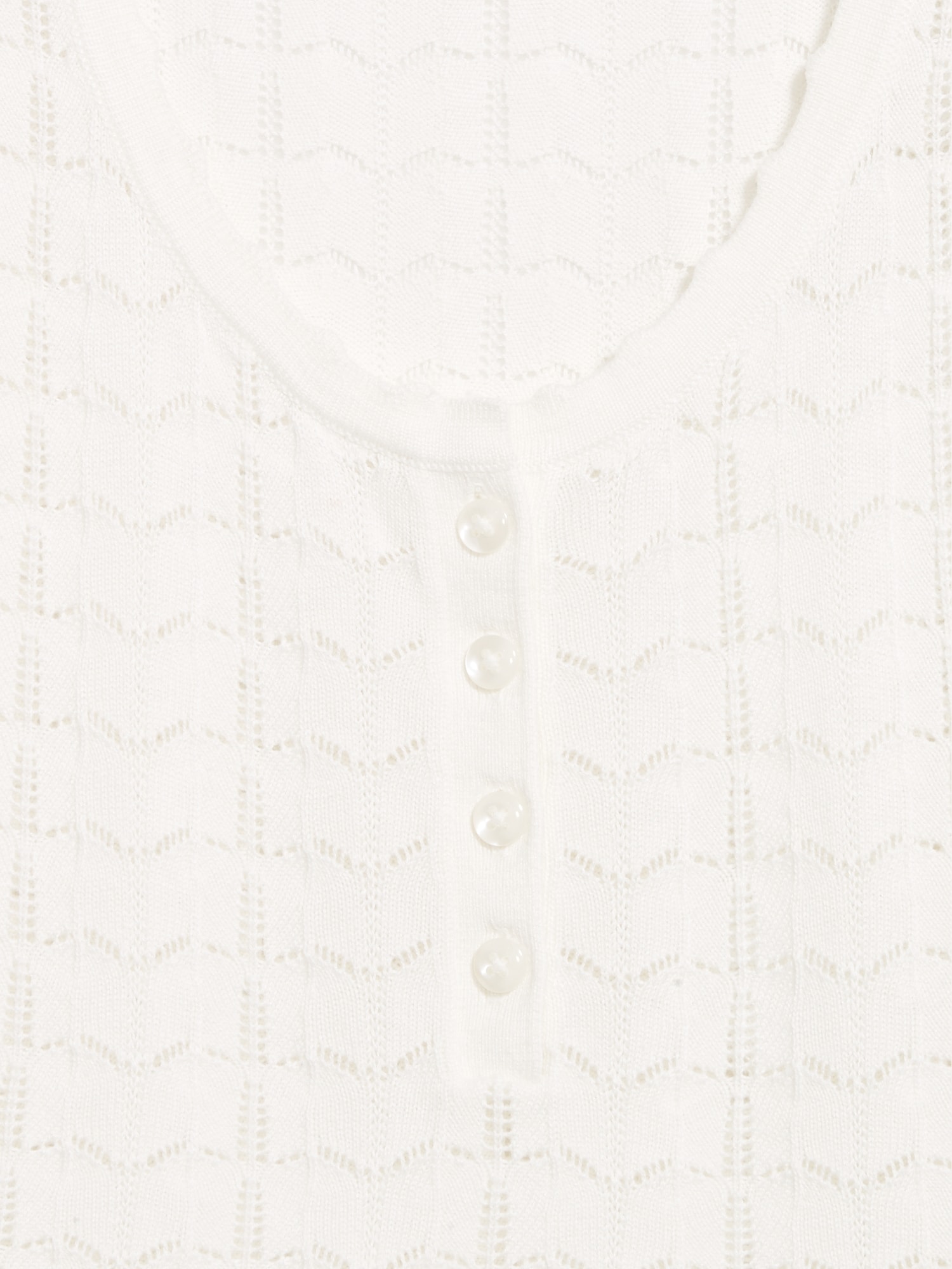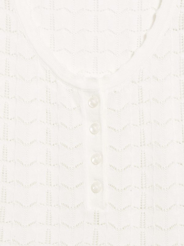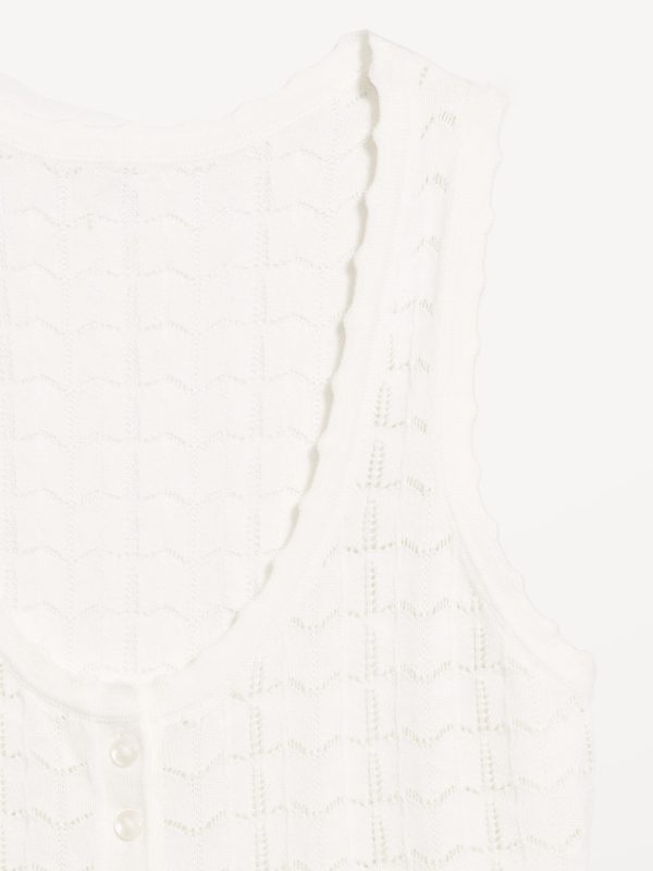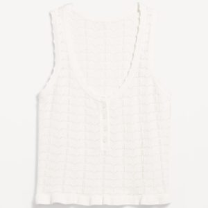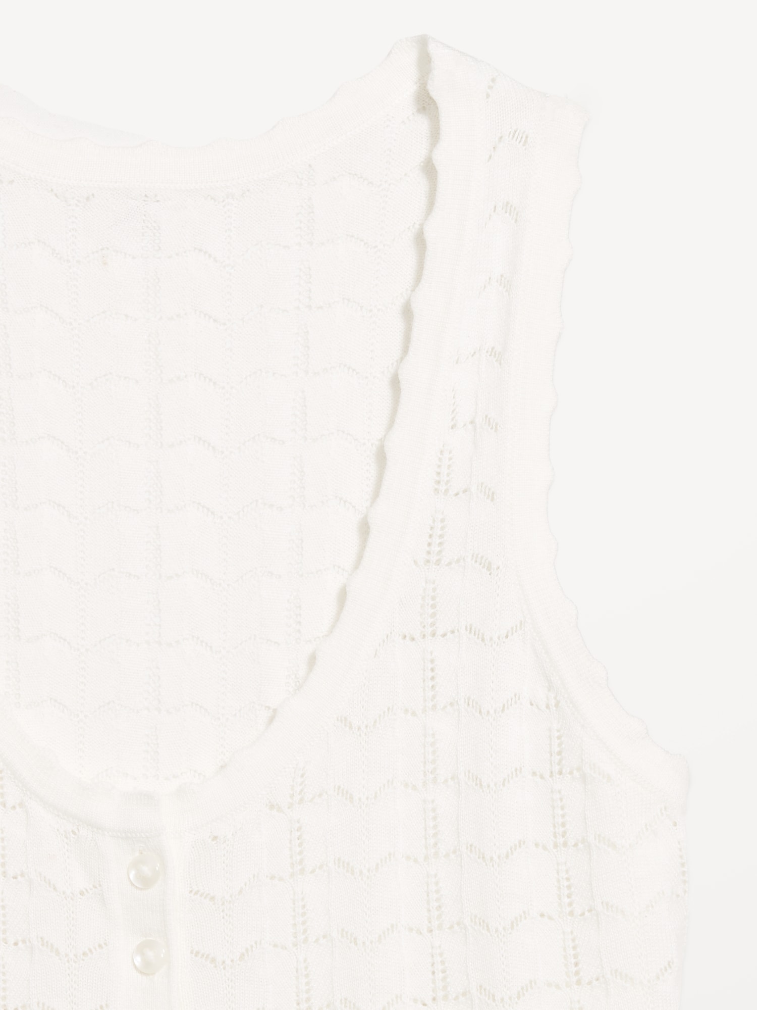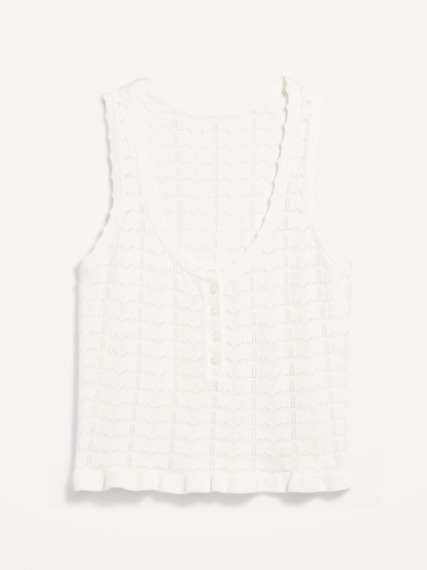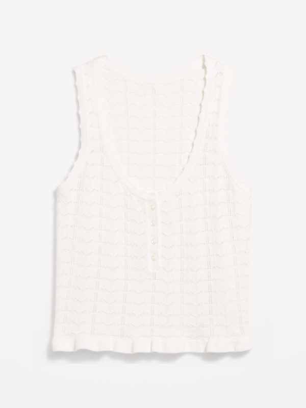Sleeveless Pointelle Cropped Henley Top: scoop neck, wide straps, button-henley placket, ruffled hem, #785032
