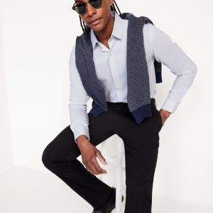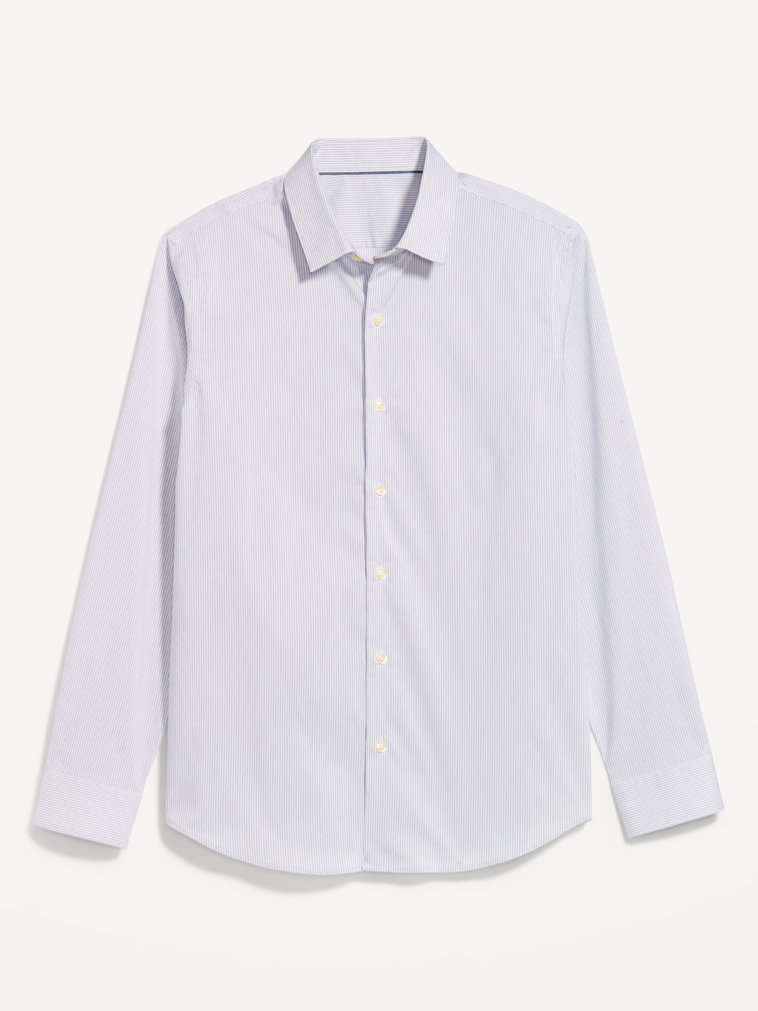 Slim Fit Pro Signature Performance Dress Shirt: 2″ pointed collar, built-in collar stays, long sleeves, buttoned cuffs, full-button front, breathable, quick drying, go-dry wicks moisture, #418103