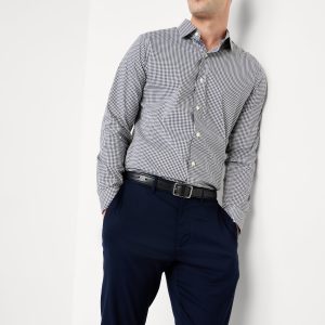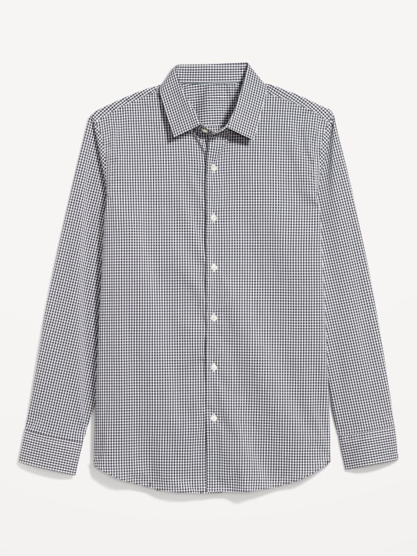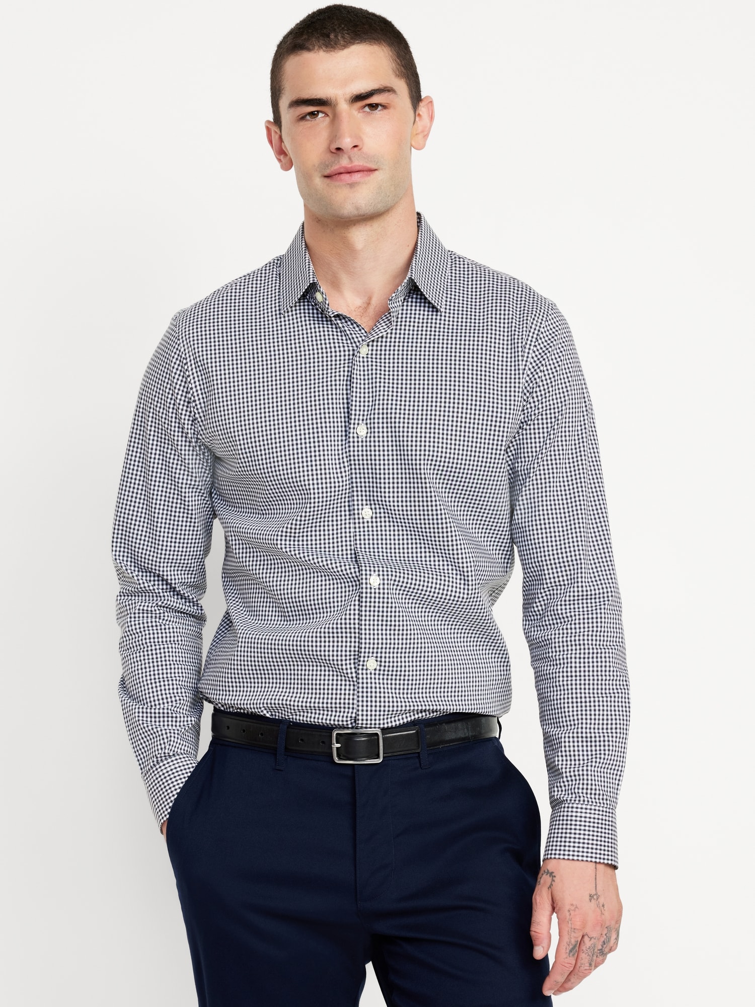 Slim Fit Pro Signature Performance Dress Shirt: 2″ pointed collar, built-in collar stays, long sleeves, buttoned cuffs, full-button front, breathable, quick drying, go-dry wicks moisture, #418103