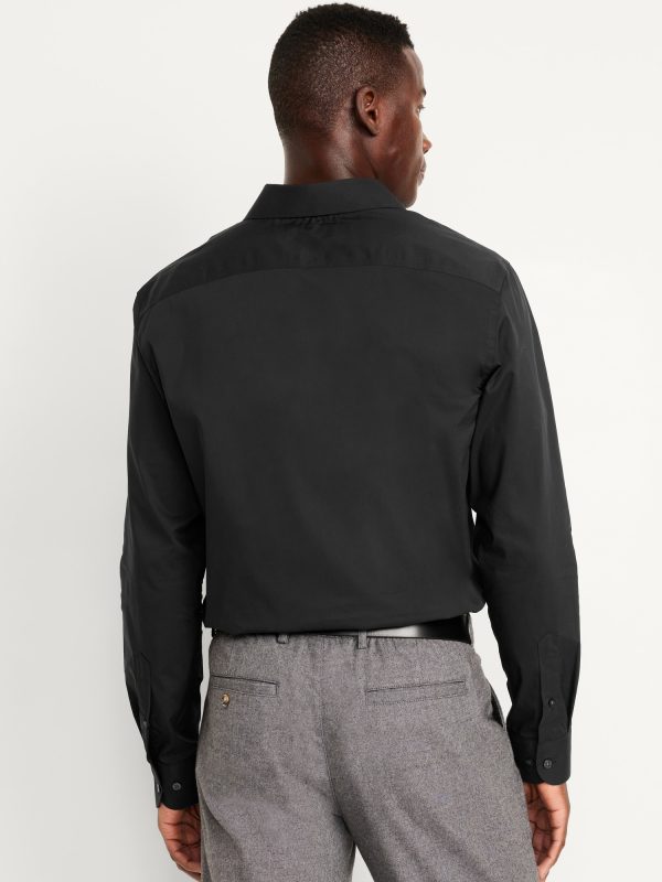Slim Fit Pro Signature Performance Dress Shirt: 2″ pointed collar, built-in collar stays, long sleeves, buttoned cuffs, full-button front, breathable, quick drying, go-dry wicks moisture, #418101