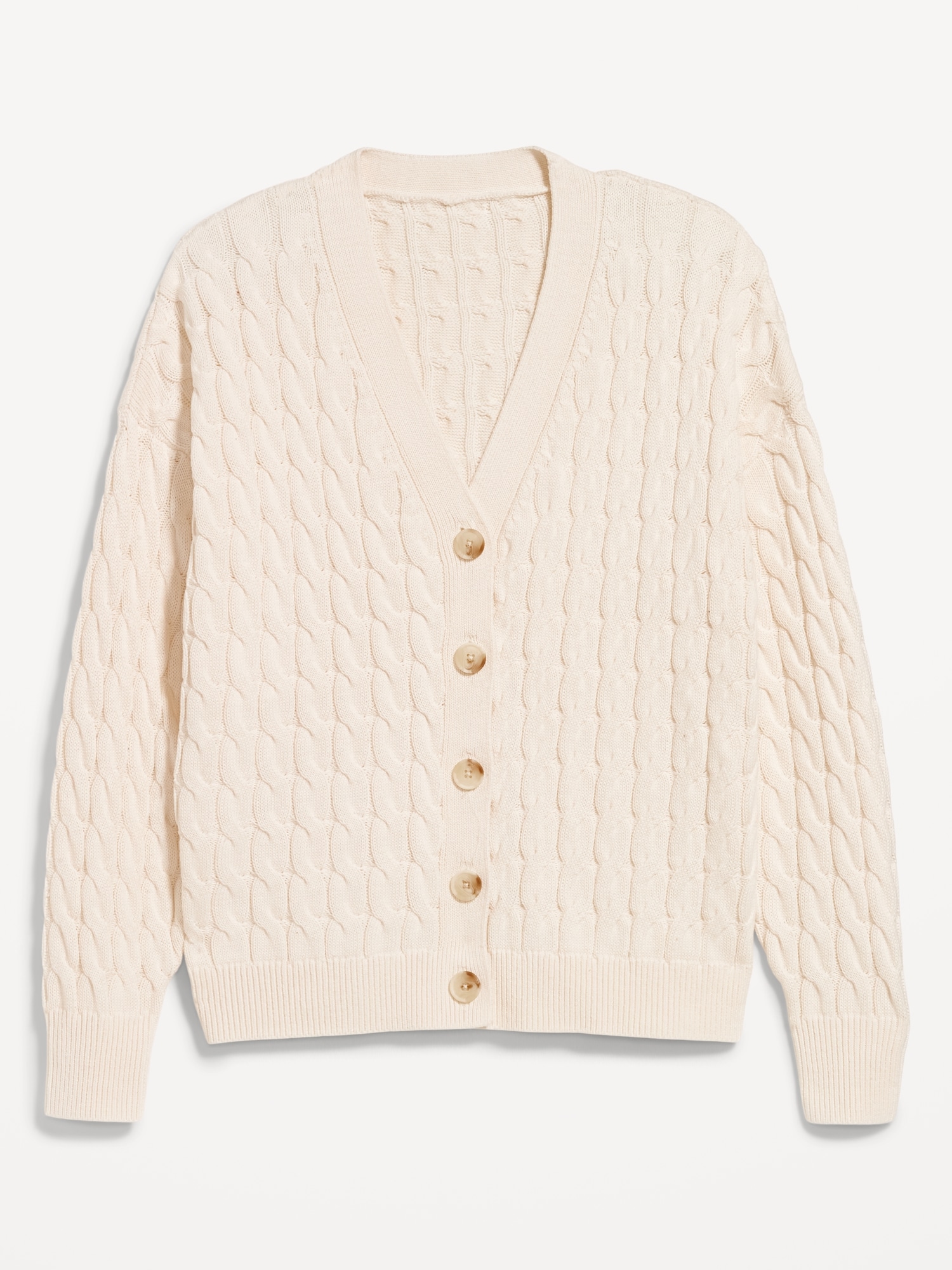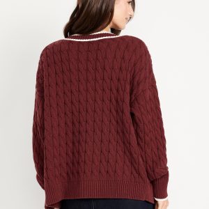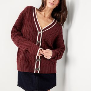 Slouchy Cable-Knit Cardigan Sweater: deep v-neck, long sleeves, button front, contrasting tipped trim, #784426