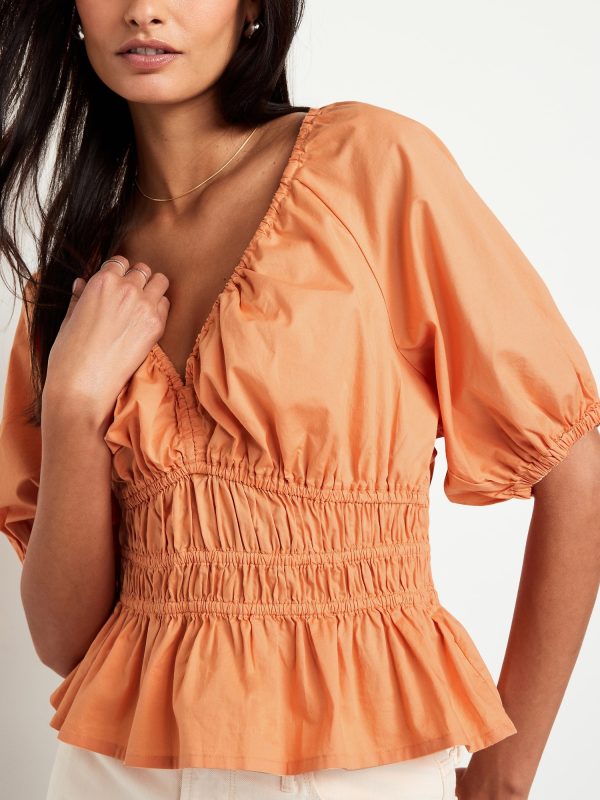 Smocked V-Neck Peplum Top: deep v-neck, elbow sleeves, elastic cuffs, smocked waist, peplum hem, gingham print, #704199