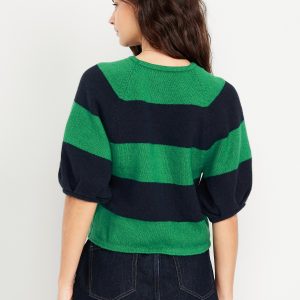 SoSoft Cropped Puff-Sleeve Sweater: Featuring SoSoft. Literally “so soft” it’s got cashmere jealous.crew neck, elbow-length puff sleeves, wide contrasting stripes, #761516