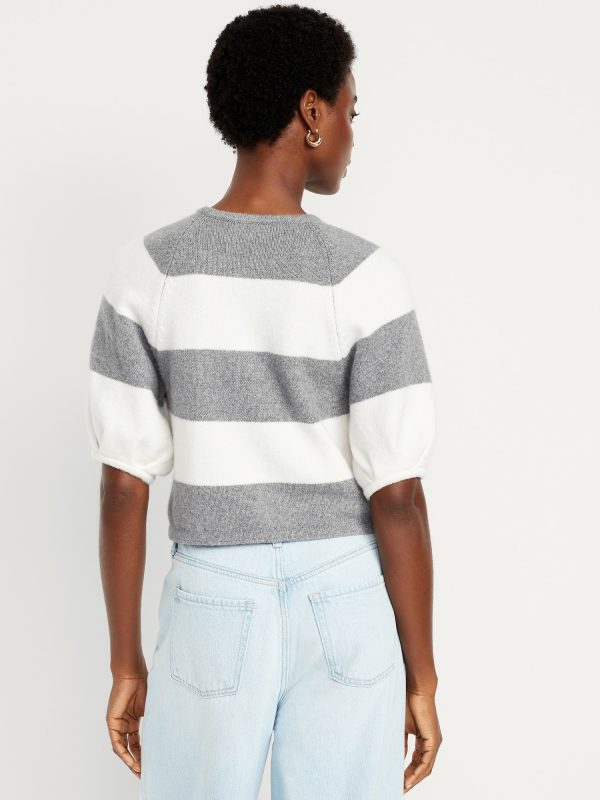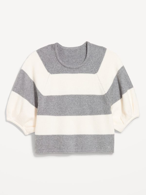 SoSoft Cropped Puff-Sleeve Sweater: Featuring SoSoft. Literally “so soft” it’s got cashmere jealous.crew neck, elbow-length puff sleeves, wide contrasting stripes, #761516