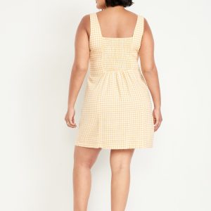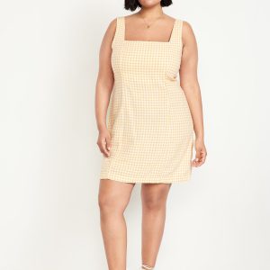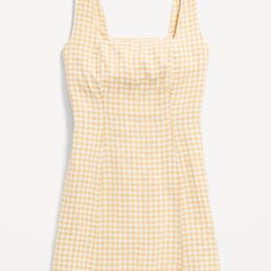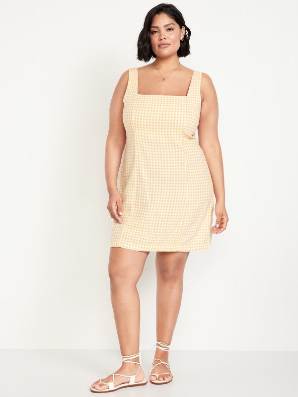 Square-Neck Linen-Blend Mini Dress: square neck, wide straps, smocked back, princess seams, mini length, gingham print, #708450