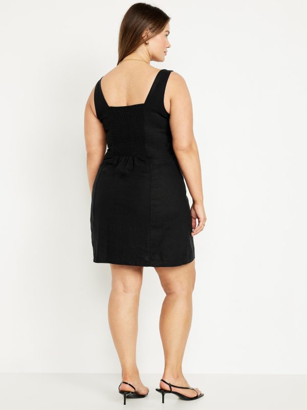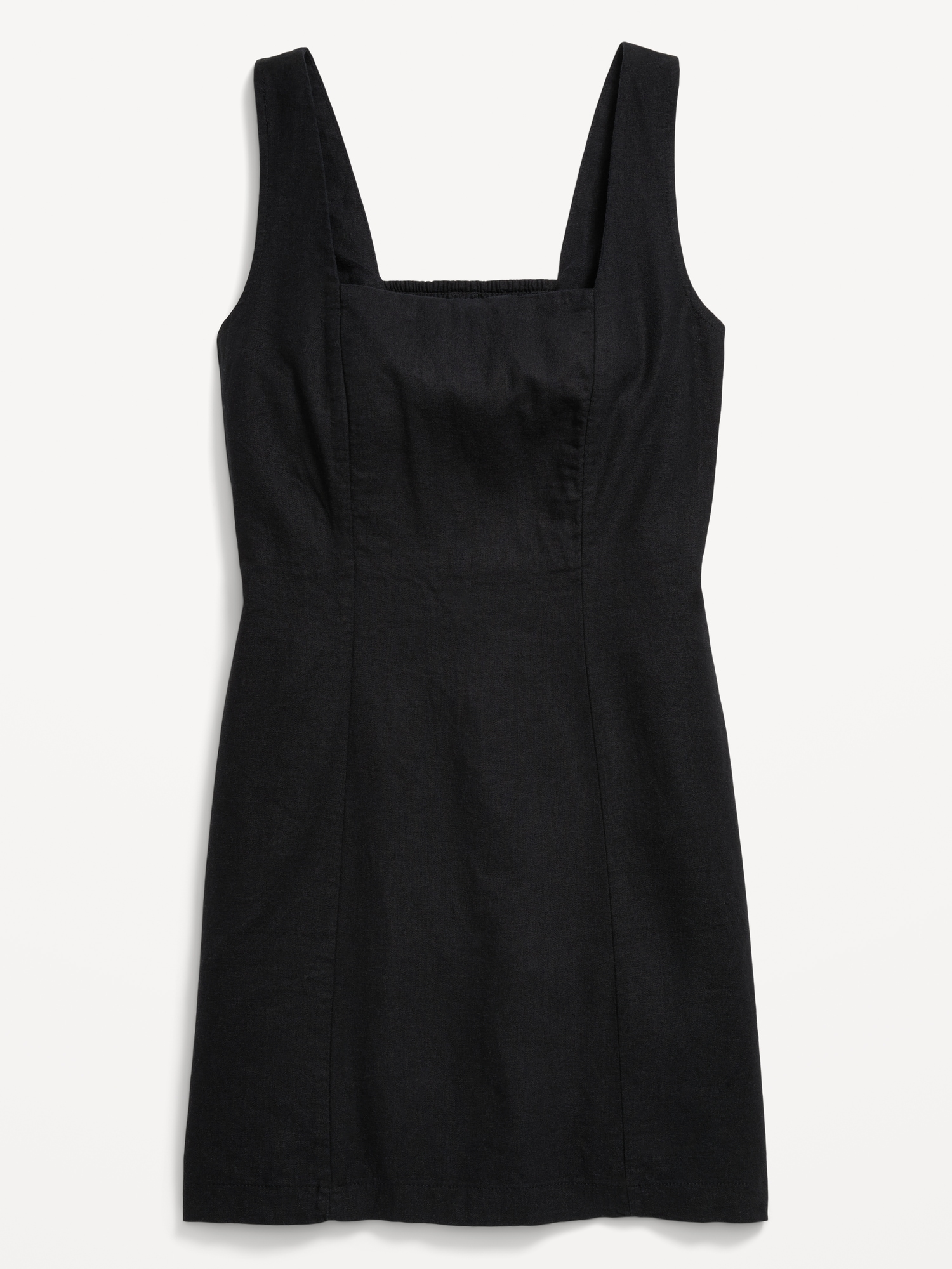 Square-Neck Linen-Blend Mini Dress: square neck, wide straps, smocked back, princess seams, mini length, gingham print, #708450