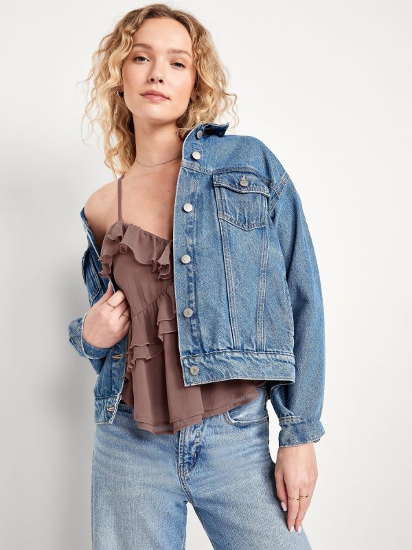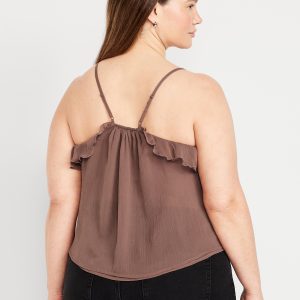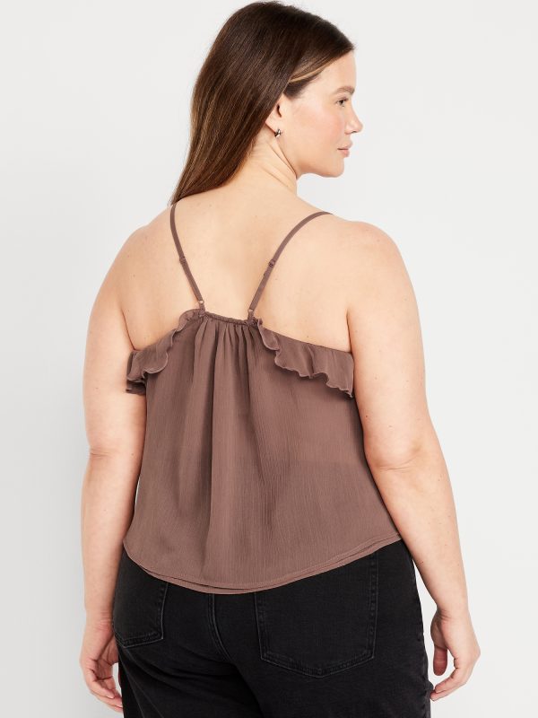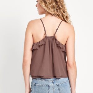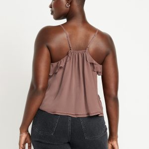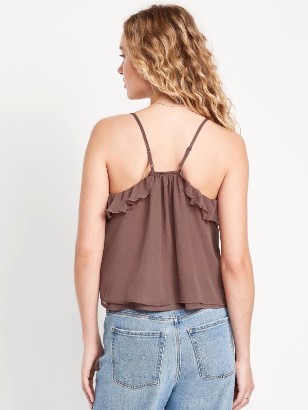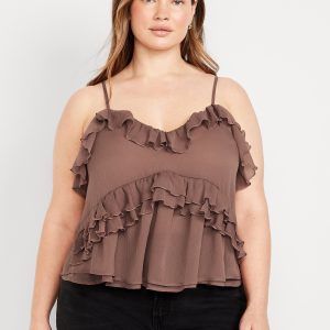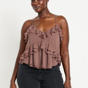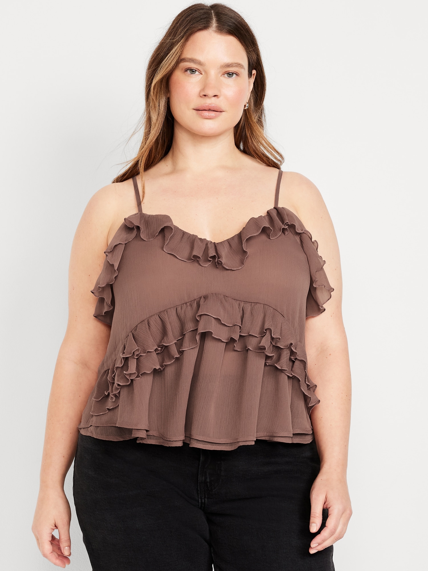 Strappy Ruffled Chiffon Top: adjustable spaghetti straps, tiered ruffle front, shirred detail, #704020