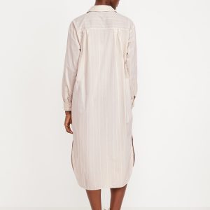 Striped Midi Shirt Dress: spread collar, long sleeves, buttoned cuffs, full-button front, patch chest pocket, vertical striped print, #726208