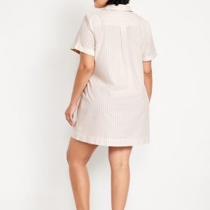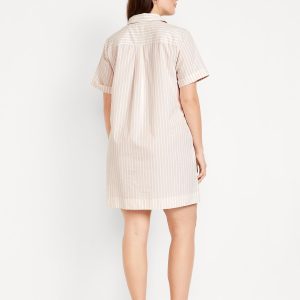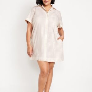 Striped Mini Shirt Dress: spread collar, short sleeves, side-seam pockets, patch chest pocket, full-button front, #705355