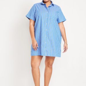 Striped Mini Shirt Dress: spread collar, short sleeves, side-seam pockets, patch chest pocket, full-button front, #705355