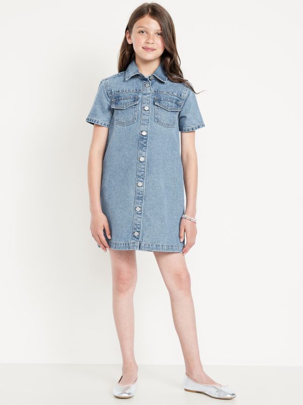 Studded Pocket Jean Shirt Dress for Girls: pointed collar, short sleeves, flap pockets at chest, studs at chest, full-length snap-button placket in sizes xs-m, full length regular button placket in sizes l-xxl, #802952