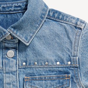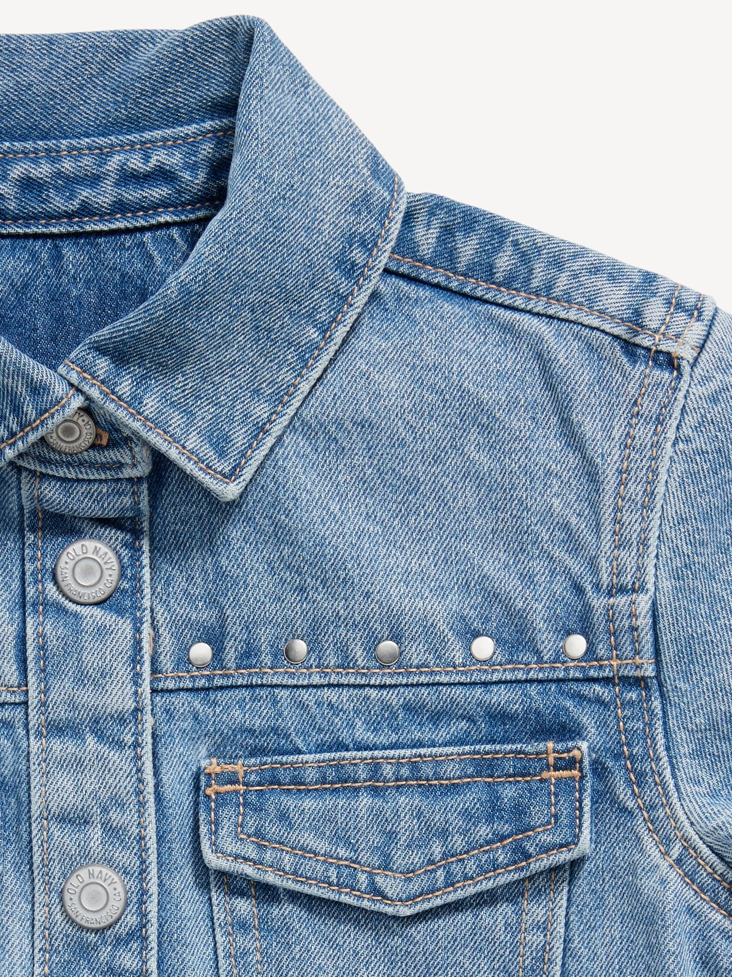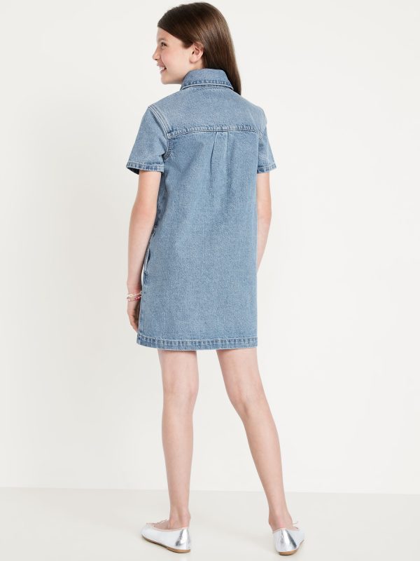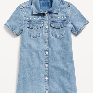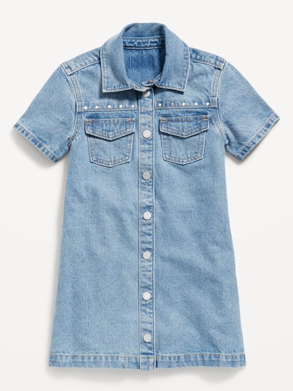 Studded Pocket Jean Shirt Dress for Girls: pointed collar, short sleeves, flap pockets at chest, studs at chest, full-length snap-button placket in sizes xs-m, full length regular button placket in sizes l-xxl, #802952