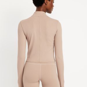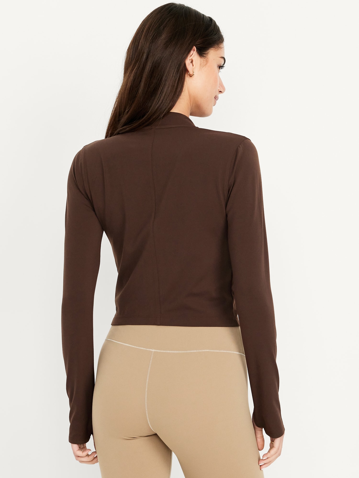 StudioSmooth Crop Full Zip: Featuring StudioSmooth. Buttery soft and breathable, with a barely-there feel.mock neck, long sleeves, thumbhole cuffs, zip front, go-dry wicks moisture, #663729