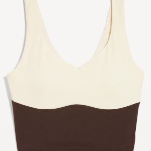 StudioSmooth Seamed Longline Top: Featuring StudioSmooth. Buttery soft and breathable, with a barely-there feel.v-neck and v-back, wide straps, shelf bra with removable pads, go-dry wicks moisture, #784415
