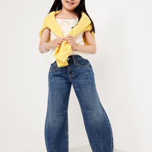 Super Baggy Barrel-Leg Jeans for Girls: mid rise, interior adjustable waistband, snap button closure (sizes 5-8), regular button closure (sizes 10-20), zip fly, scoop pockets and coin pocket, patch pockets at back, barrel leg, #803738