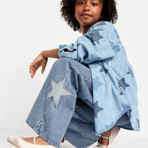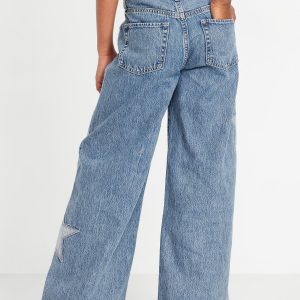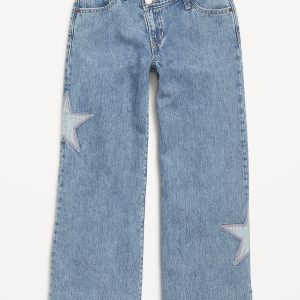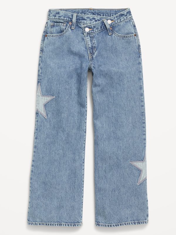 Super Baggy Embroidered Crossover Wide-Leg Jeans for Girls: mid rise, interior adjustable waistband, crossover waist, snap button closures (sizes 5-8), regular button closures (sizes 10-20), zip fly, scoop pockets and coin pocket, patch pockets at back, wide leg, embroidered stars, #803761