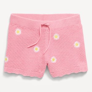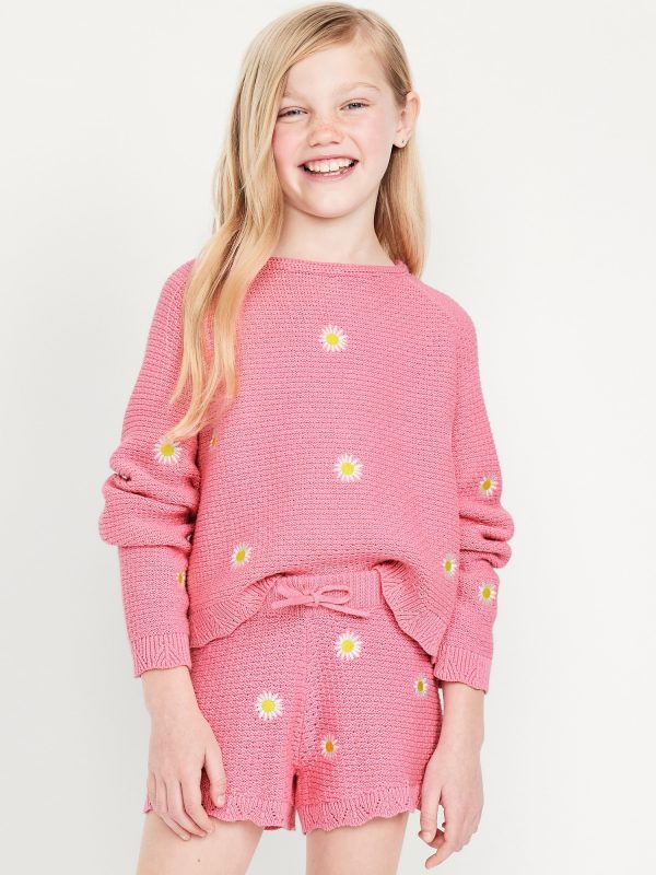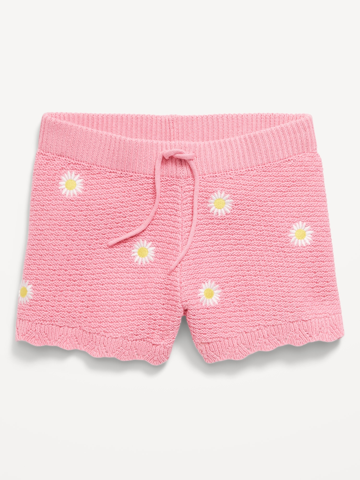 Sweater-Knit Embroidered Shorts for Girls: elasticized waistband, functional drawstring, all-over embroidery, crochet knit, #728868