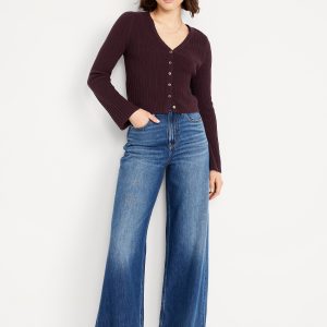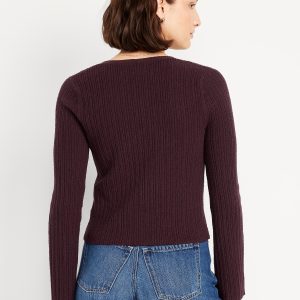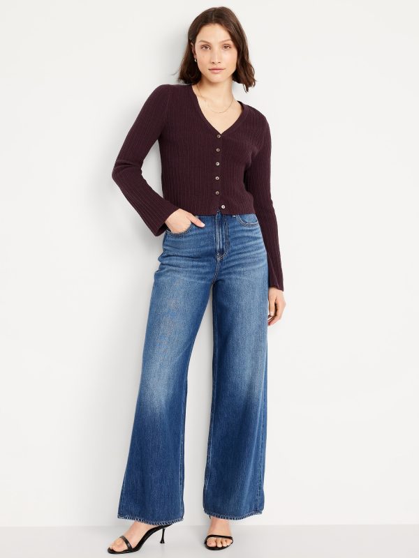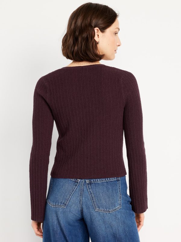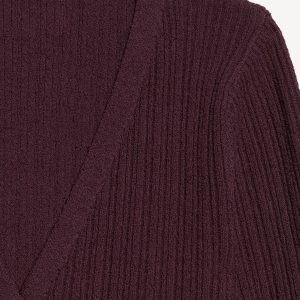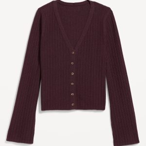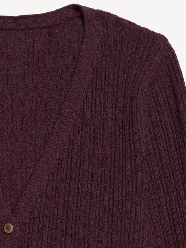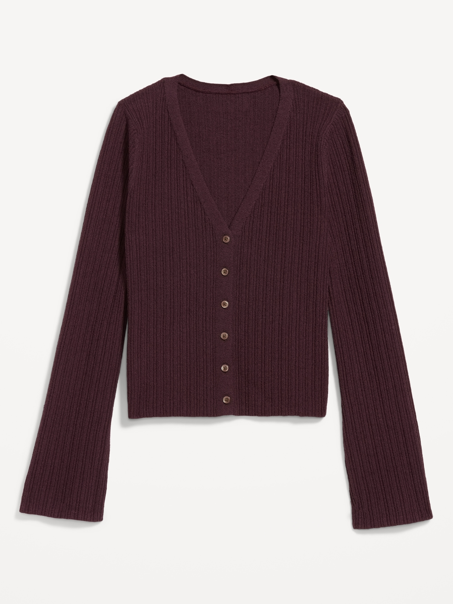 Textured Bouclé Button-Down Sweater: deep v-neck, long bell sleeves, button front, #761519