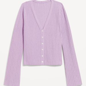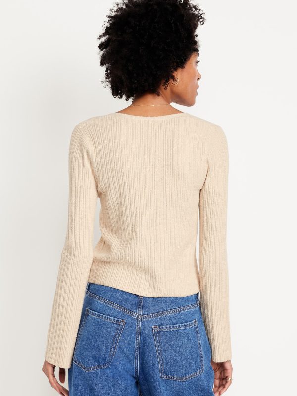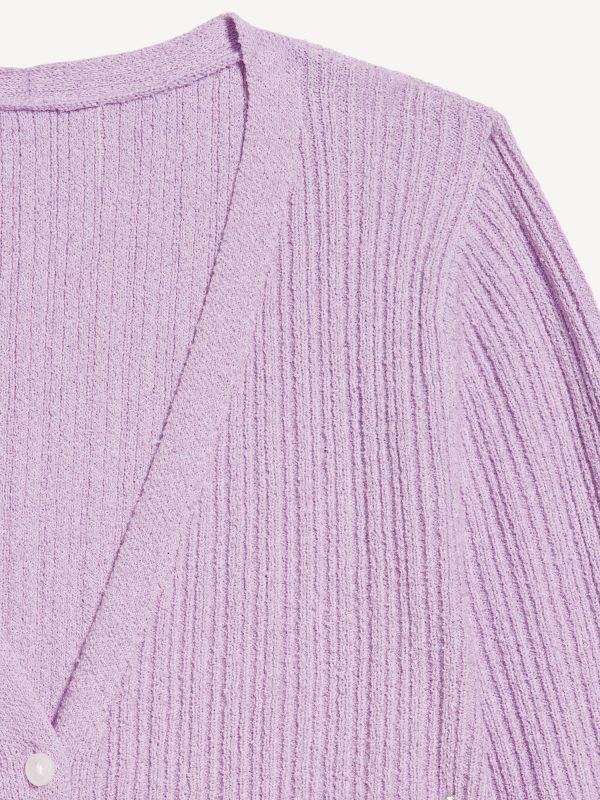 Textured Bouclé Button-Down Sweater: deep v-neck, long bell sleeves, button front, #761519