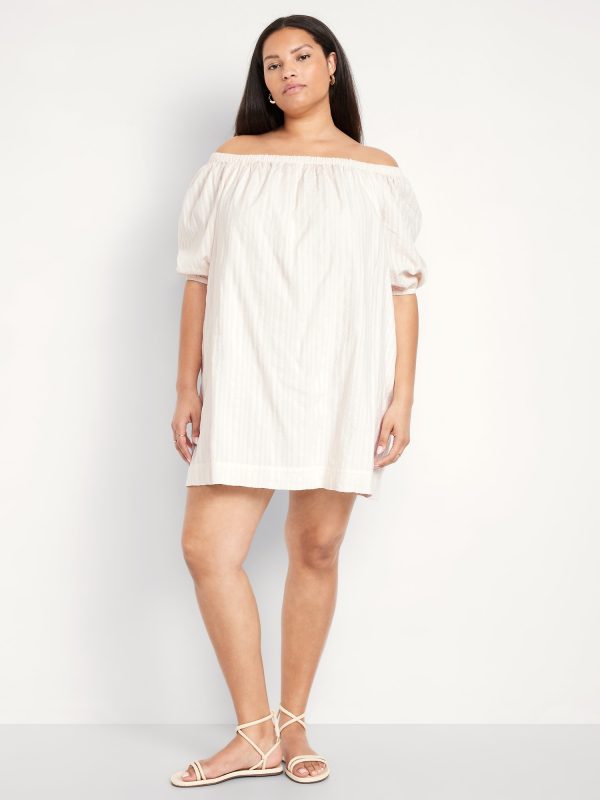 Textured-Dobby Mini Swing Dress: elastic neckline can be worn on or off shoulder, elbow-length puff sleeves, on-seam pockets, mini length, striped print, #766924