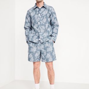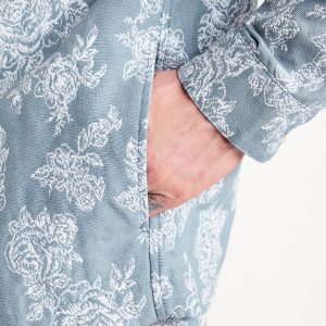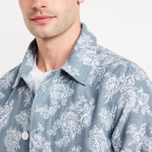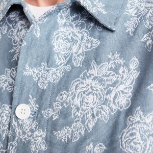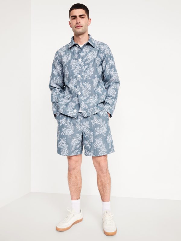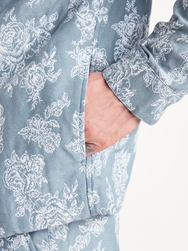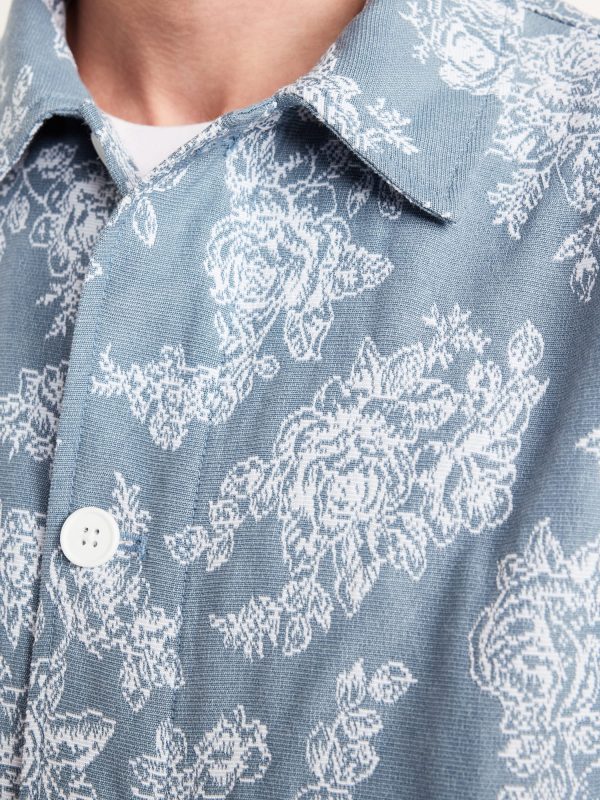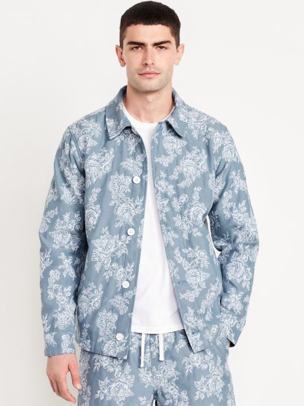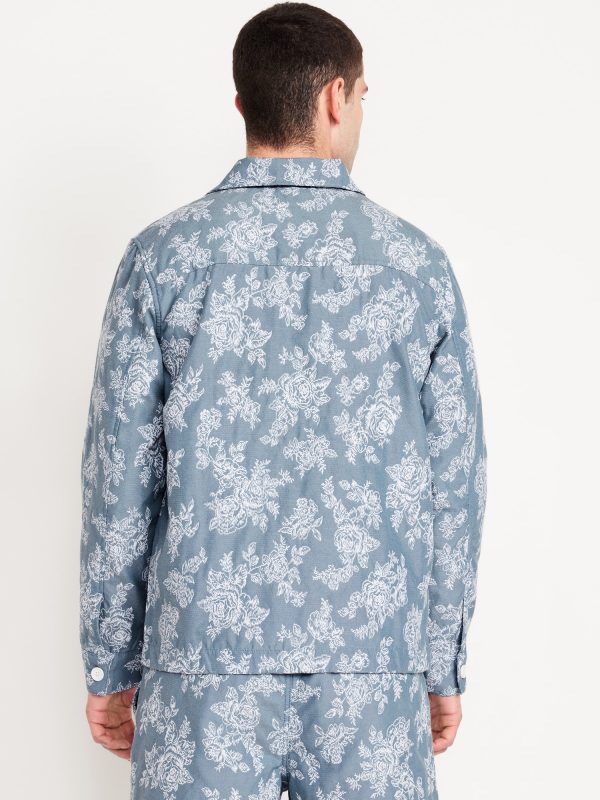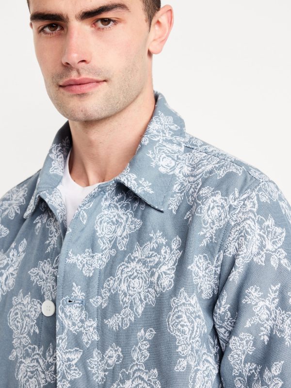Textured Floral Shirt Jacket: spread collar, long sleeves, buttoned cuffs, full-button front, floral print, #686485