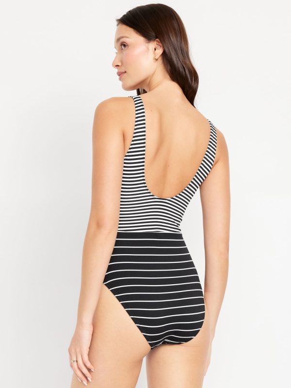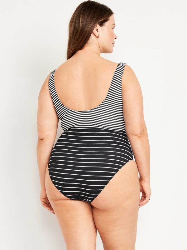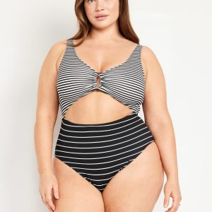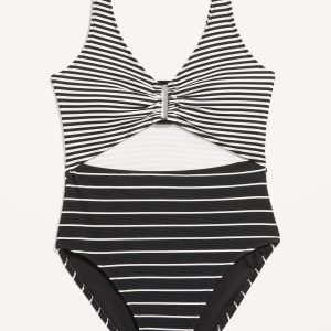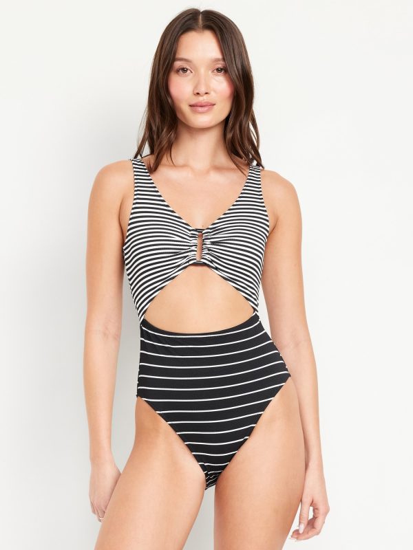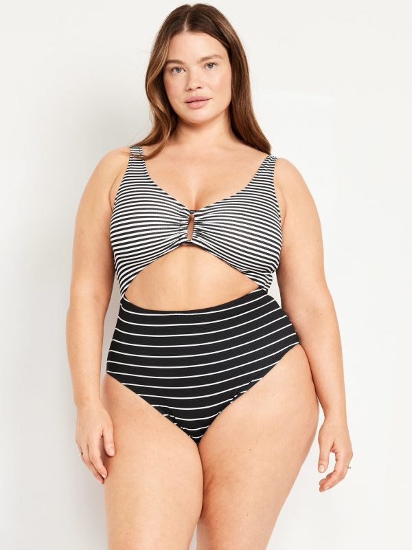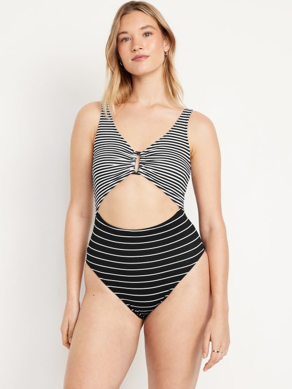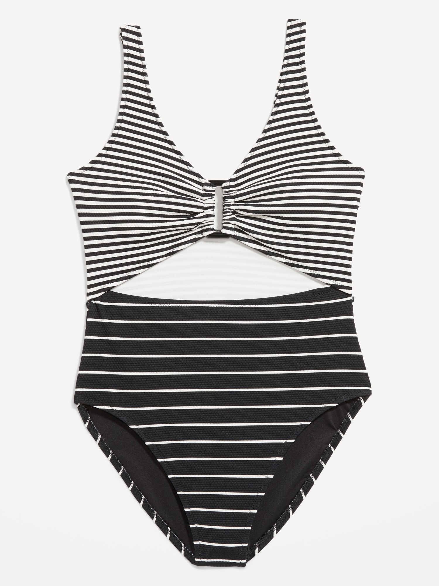 Textured One-Piece Cut-Out Swimsuit: v-neck, wide straps, scoop back, removable pads, cut-out front, elasticized leg openings, #660700