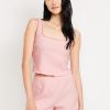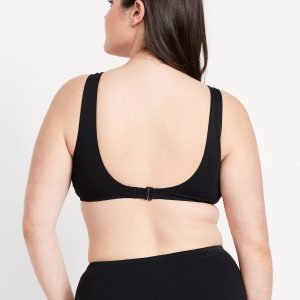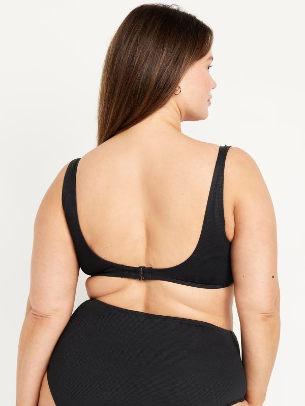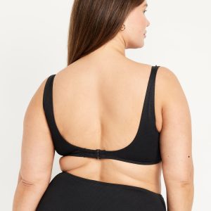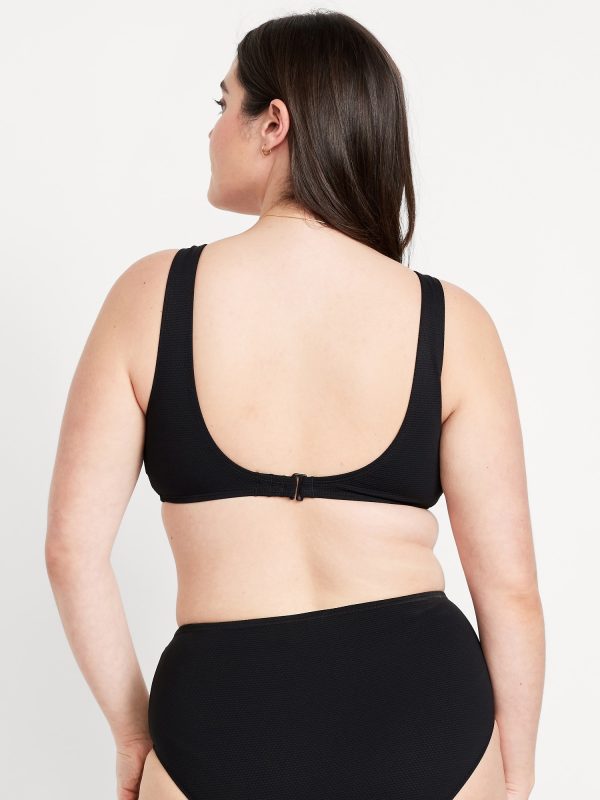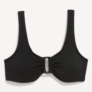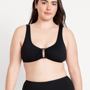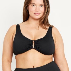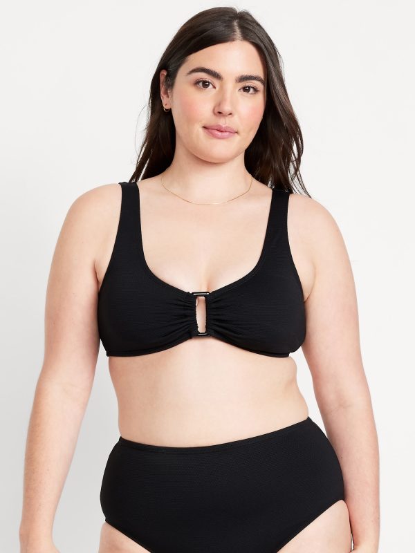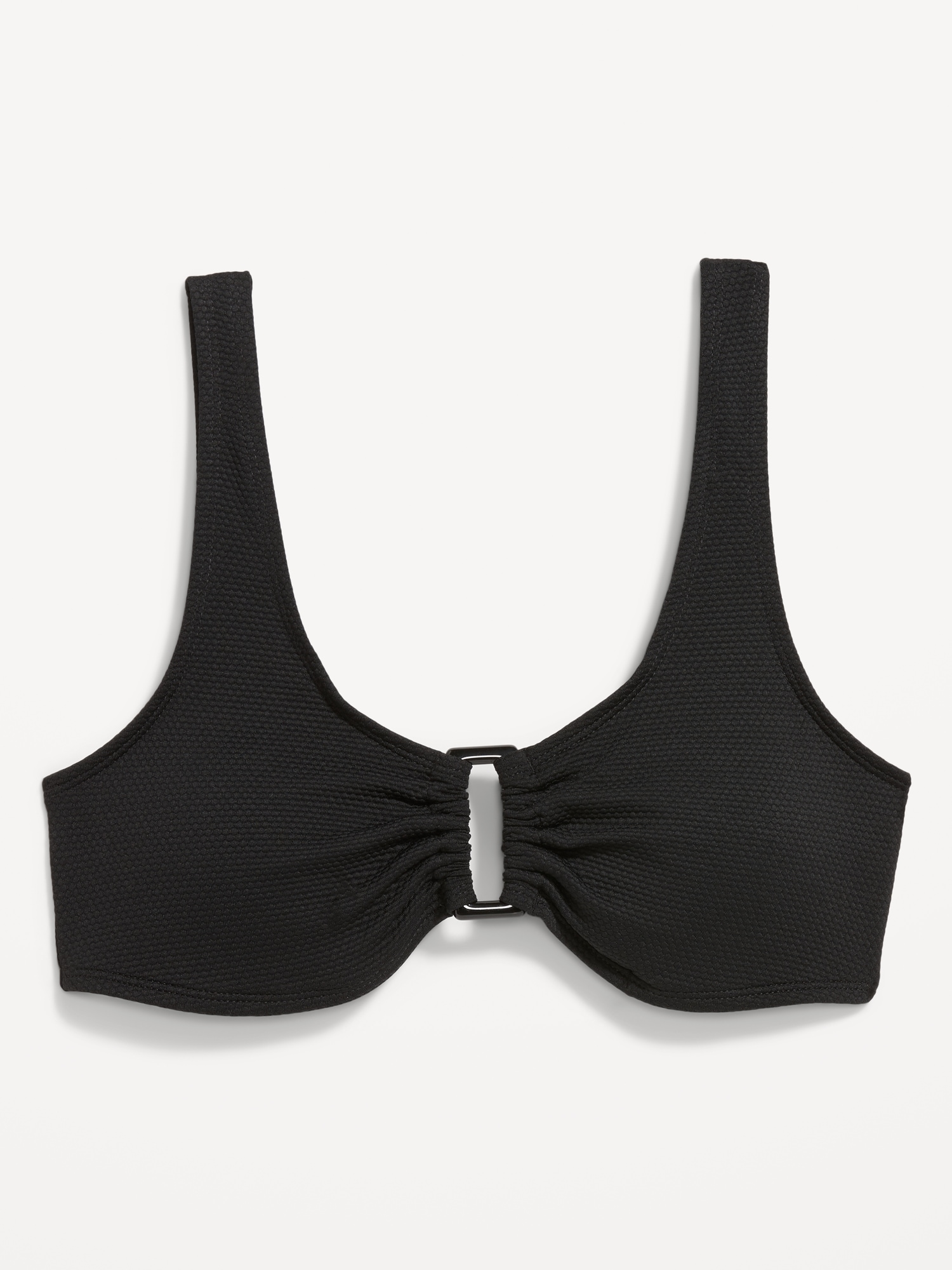 Textured Swim Top: scoop neck, wide straps, ruched front with o-ring accent, removable cups, hook-and-eye clasp at back, #660878