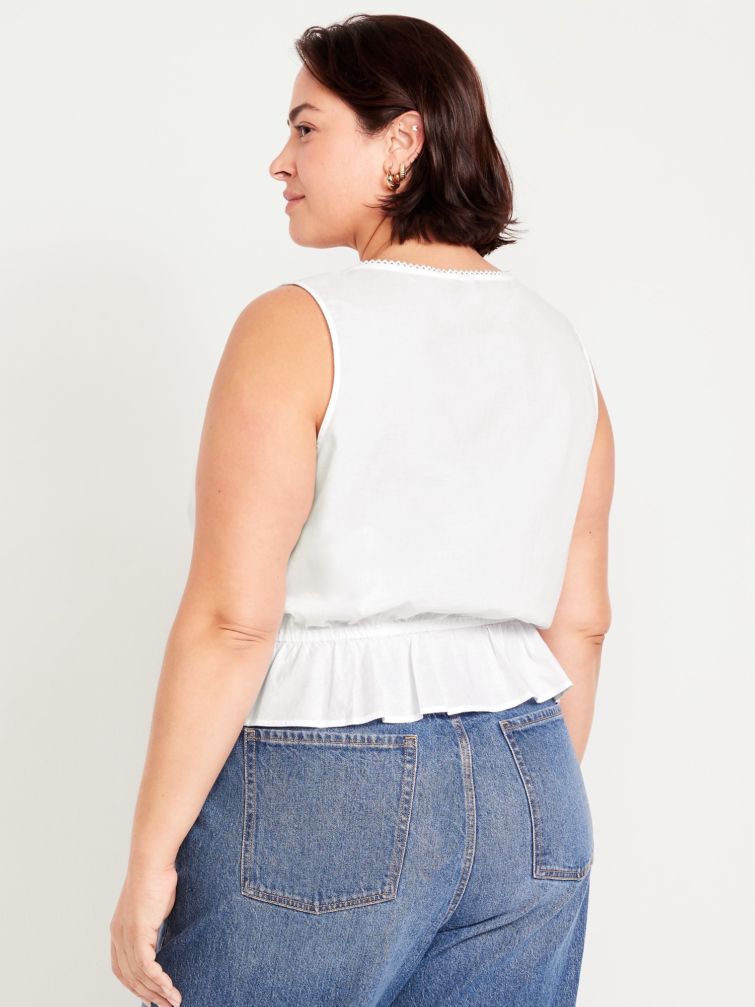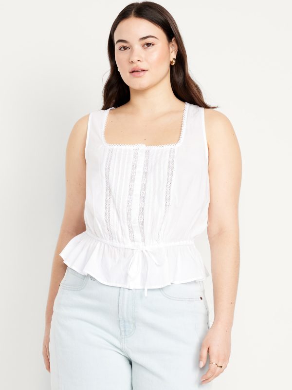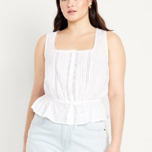 Tie-Waist Lace-Trim Top: picot lace-trim square neck, wide straps, five-button front, elastic tie-belt waist, #705128