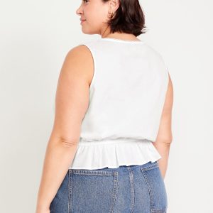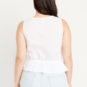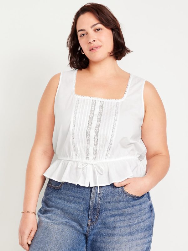 Tie-Waist Lace-Trim Top: picot lace-trim square neck, wide straps, five-button front, elastic tie-belt waist, #705128