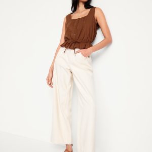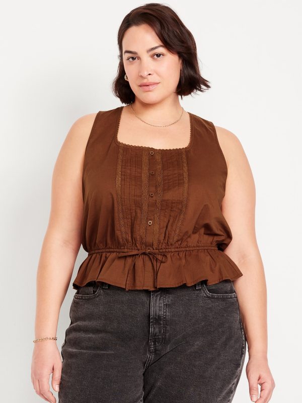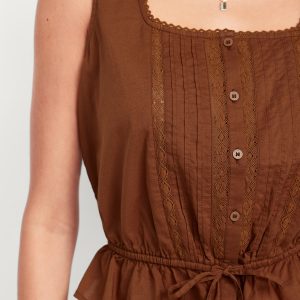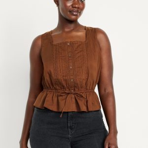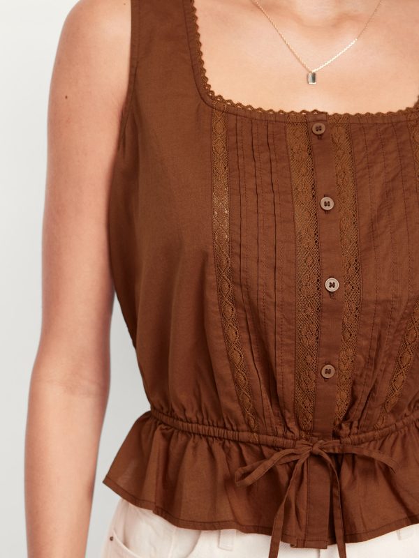 Tie-Waist Lace-Trim Top: picot lace-trim square neck, wide straps, five-button front, elastic tie-belt waist, #705128