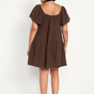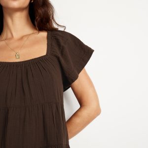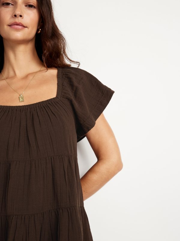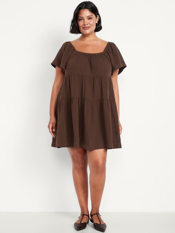 Tiered Mini Swing Dress: square elastic neckline, flutter sleeves, tiered seams, shirred detail, #809629