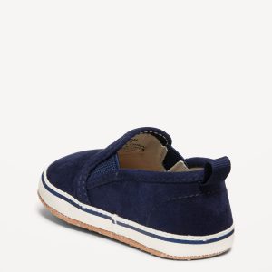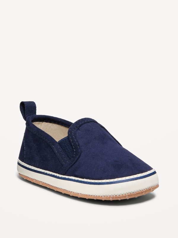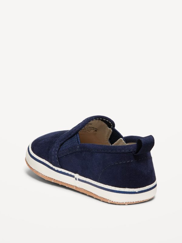 Unisex Slip-On Sneakers for Baby: linen-blend or faux-suede upper, webbed goring at sides, cushioned foot bed, contrasting midsole, gripper dots at outsole, pull tab at heel, #688499