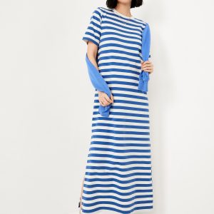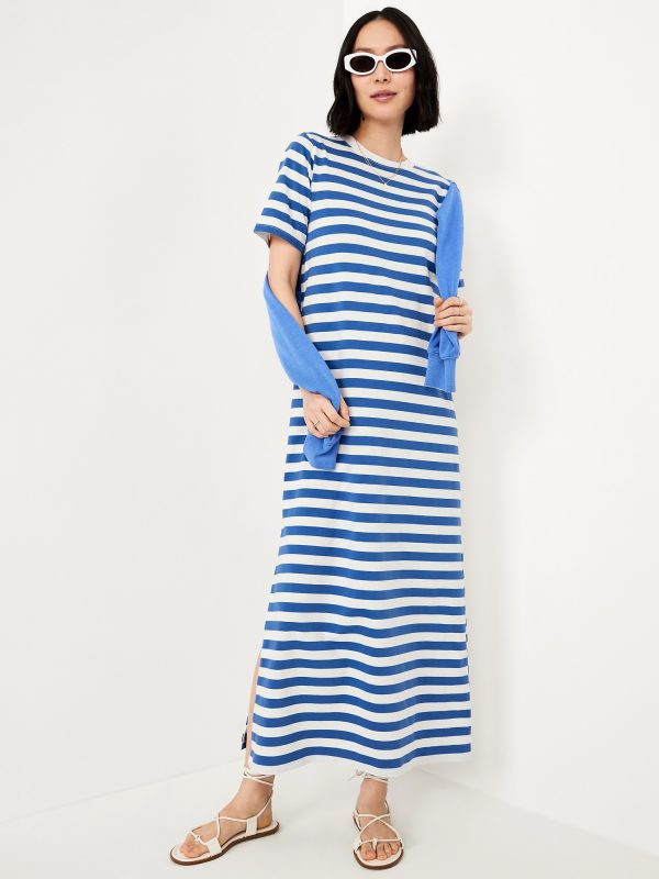 Vintage Crew-Neck Maxi T-Shirt Dress: A super relaxed fit with lived-in feels.rib-knit crew neck, short sleeves, side slits, striped print, #705306